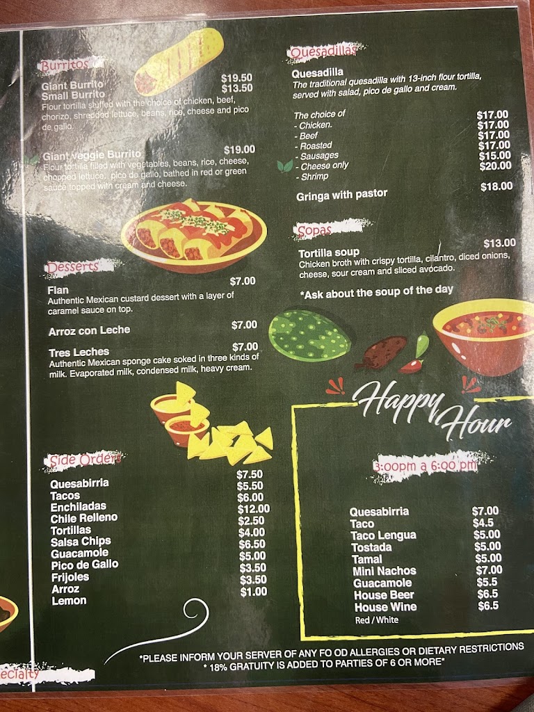 The food was delicious though the portions were a little small for the price. The quesadilla had very little filling, not even close to filling the large tortilla. I will probably try the restaurant again as the Quesabirria was delicious, but I wouldnt order the quesadilla again. It was disappointing and definitely not worth the price.