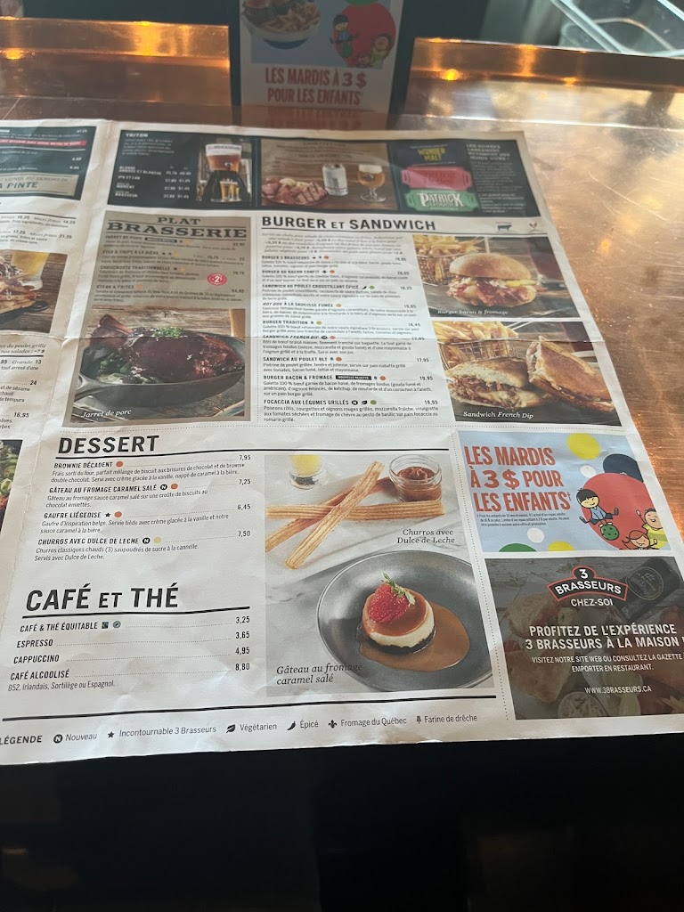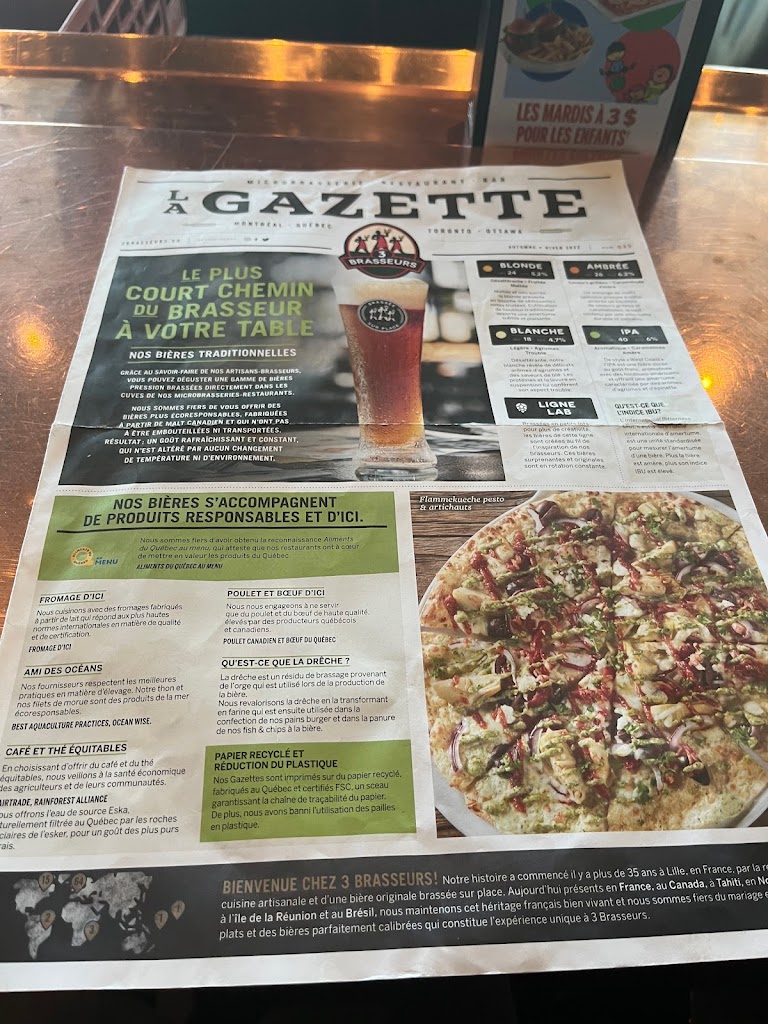 It was our first time at this 3-brasseurs, Centropolis Laval, I highly recommend, everything was perfect, the relaxed atmosphere, the excellent food, and what can I say about the service from Ramona who even took the time to adjust our table who moved a little and brought me a sample of the breaded fries, which I didnt know existed. Thanks again