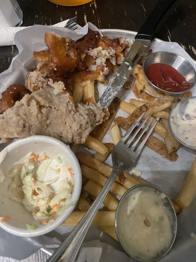 For fish and chips - overcooked, brownish batter not attractive. Blonde is always more attractive. Tartar sauce made with dill pickles is not the idea of the century - too acidic. Tartar sauce should always be made with sweet relish