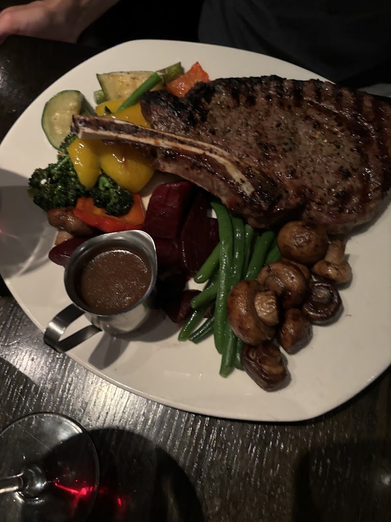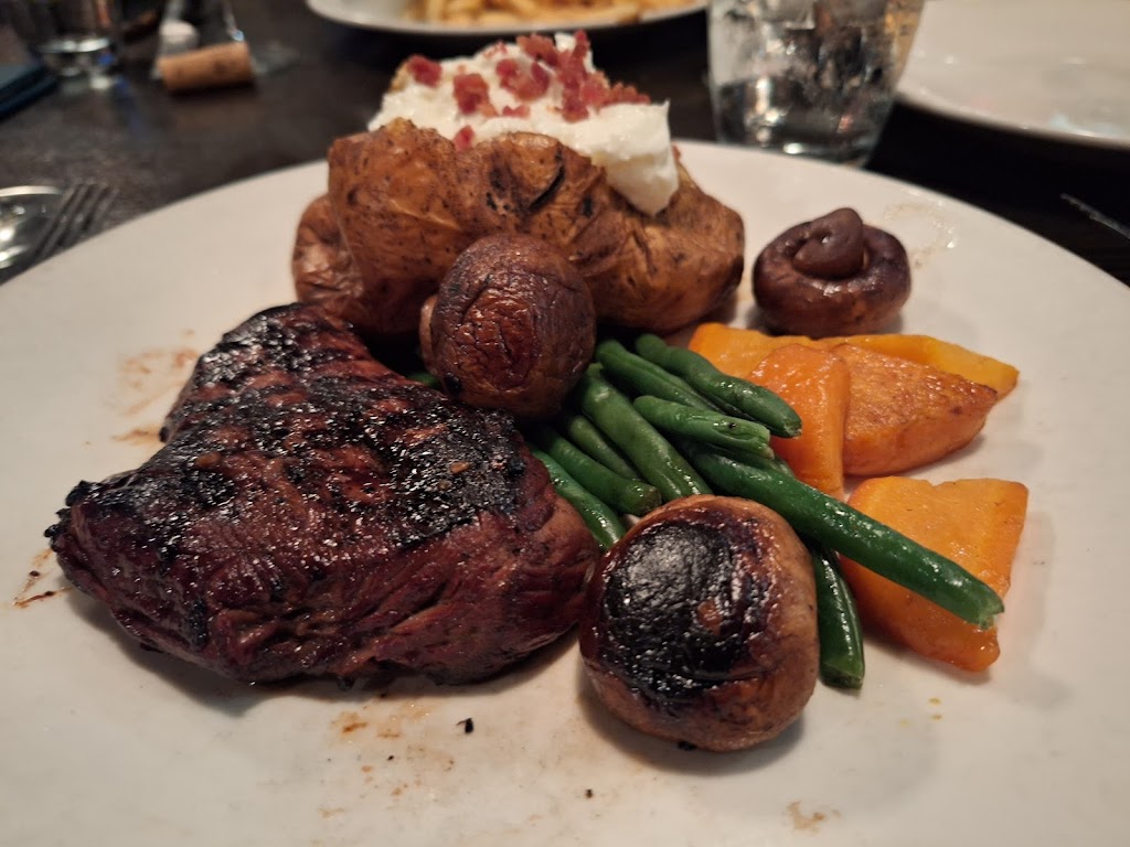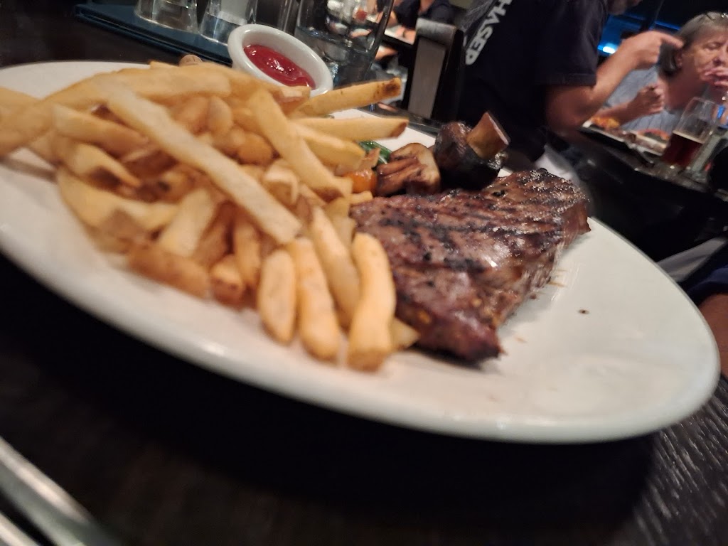 We were meeting another couple for dinner. We were the first to arrive and the hostess wasn t particularly friendly. The young lady who showed us to our table made up for the previous one as she was engaging and friendly. Our waitress Katia was superb. Friendly and efficient and with a smile on her face. We all enjoyed her service. I wanted to order a beer but did not like their draft selections. My wife s Aperrol spritz was average. My wife ordered the 6 ounce top classic top sirloin and she said it was a good steak. I had the 18 ounce prime rib (see picture) and it arrived looking like someone had dropped it. It was a good prime rib but not the best I ve had. Another disappointment was cold French fries and too little jus. Also we were inundated with fruit flies the whole evening and when we asked the waitress, the reason was the fruits from the bar. My wife and my friends wife were swatting all night. I guess due to the hair products. Time for a solution to that!!! Overall the service really made the difference. I wouldn t say don t go but I m not in a hurry to go back. Parking: Mall parking can be challenging during mall opening hours but gets better after mall closes