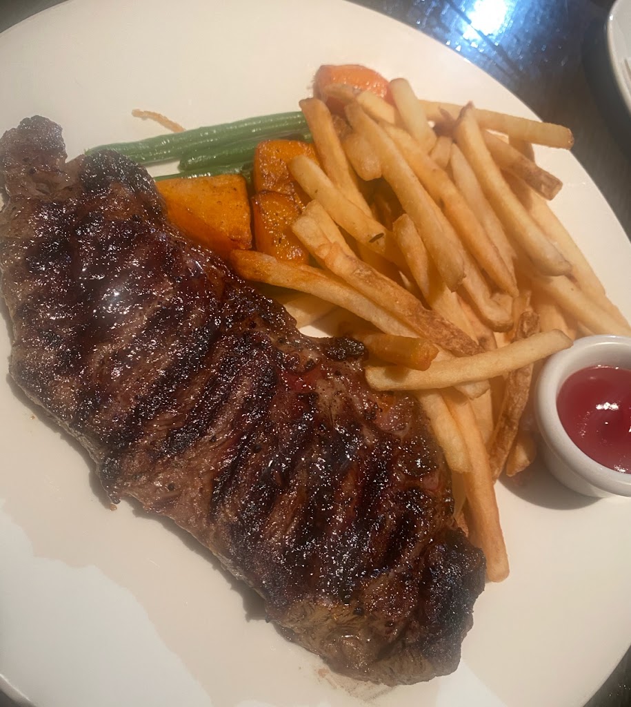 I got the Chicago style steak medium rare with Monte-Carlo potato and sides. It’s a great location and atmosphere to be in. Service can be a bit slow depending on timing. Food is always consistent and good, but maybe lacks a little flair or creativity.