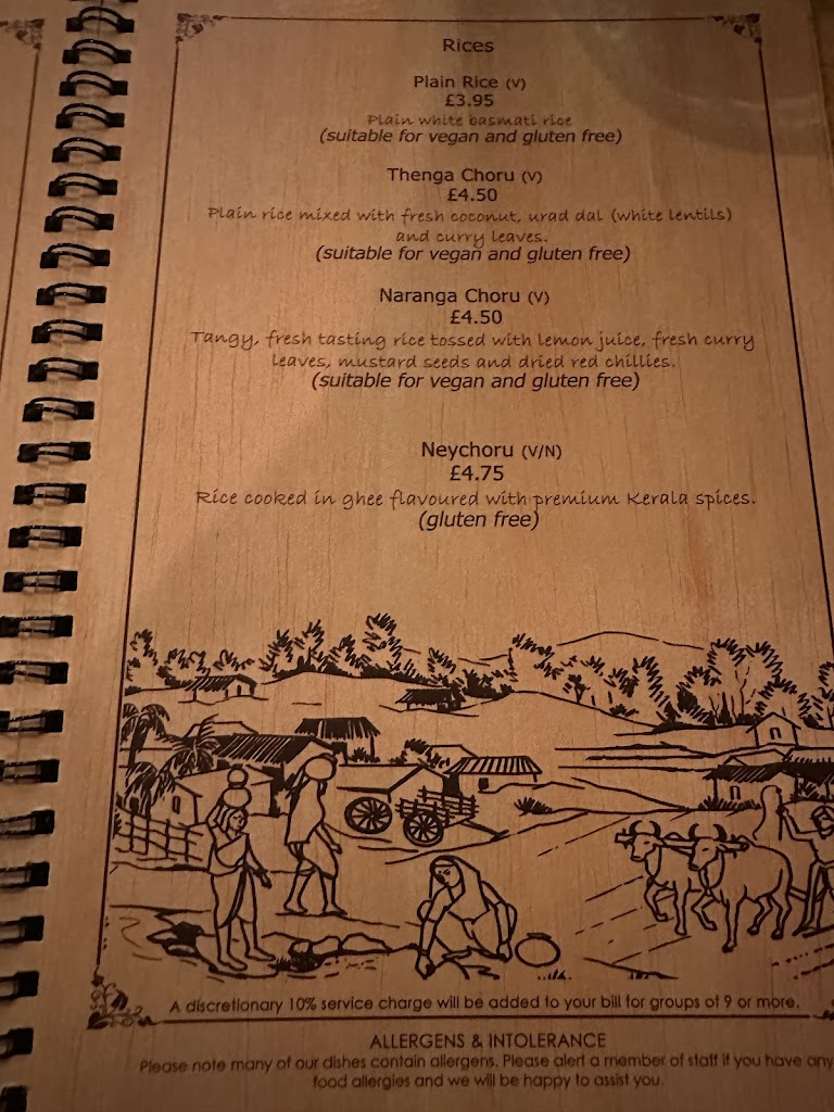 Kerala foods mainly.. super arranged interiors with stylish furnitures. Average food.. maybe because main items were over as we were late.. glad that they still took orders and served neatly. Parking for the hotel is a public one- opposite tobthe hotel-Regent street paid street parking- £1.40 for 1 hour. Can use ring go app or coins.. no card payment
