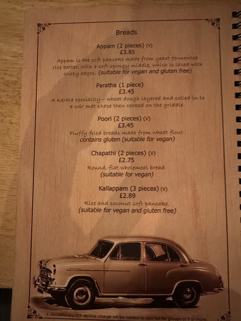 Vegetarian options: Absolutely amazing kerala cuisine. One of the best in the North West and Midlands. Authentic south indian dishes served in this restaurant. Parking: Will have to find street parking in one of the cross roads if the paid street parking outside the restaurant is full.