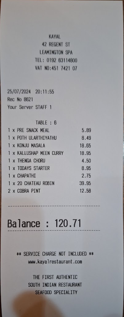 This is a great Southern Indian style restaurant. We've been to their sister restaurant in Nottingham and always enjoyed it, but maybe because of the layout, it's not as good an atmosphere as the Leamington one. We had the beef that "Dad eats with his drinks," which was absolutely superb, and I would order that again, no problem. The blonde (on food critic reference for those that remember!) ordered the special prawn starter. A dry, but full of flavour starter. Perfect to get going. We then had a fish curry (tilapia, a white fish) which was tasty and a prawn curry which had a coconut flavour which was pur favourite. But, both were good. We wouldn't normally order fish in a standard Indian restaurant as it's often frozen and just not enough fish orders to be confident in the freshness and quality. Not at Kayal, where fish is a large part of the menu and well worth trying. Our only issue is we didn't have space to order 'from the garden' or some other meat dishes that all sounded great. Next time. Because there will be another visit soon. Service was great with a very friendly waitress who knew her stuff, was quick on the order, and helpful. And engaging with a smile. If only more could be like that! Even the manager came over to see how we were and gave us a bit of a background on the restaurant. We sat downstairs in the corner and the table was fine and the room downstairs a more relaxed atmosphere, which actually suited us. Perhaps being tucked away meant it was a little harder to ask for something from the staff, but it was no bother to stand up and walk 5 metres around the corner and ask for something. The only MINOR gripe was that the downstairs area is also where the delivery drivers wait, so behind our table was two drivers in riding gear and bags, just hanging around. Didn't do too much for the atmosphere when one left their motorbike running outside the door (which was open because it was warm). As I say, a minor gripe that didn't detract from what was a great meal. I get that delivery is an important income, so perhaps just worth thinking about options for them to wait.
