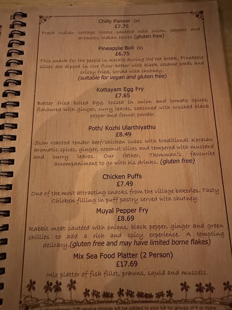Delicious menu inspired by Kerala (S India) which was extremely tasty. Service was faultless, We weren t rushed through the courses and the ambience is so warm and relaxed. I left my handbag behind and it was returned safely, thank you.