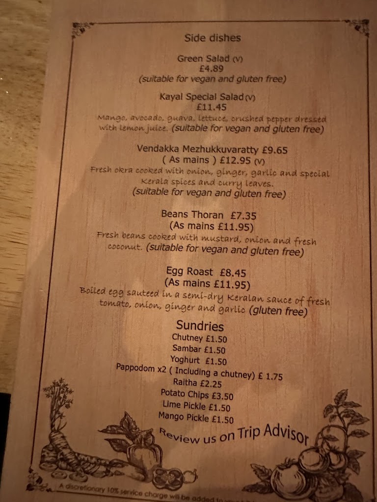 Not worth for money anymore. They have reduced the items in the menu, particularly the vegetarian curries. They dont serve the malabar parotta any longer. I would recommend eating in Coventry if youd like south Indian food as there are good restaurants which are very reasonable pricewise too.