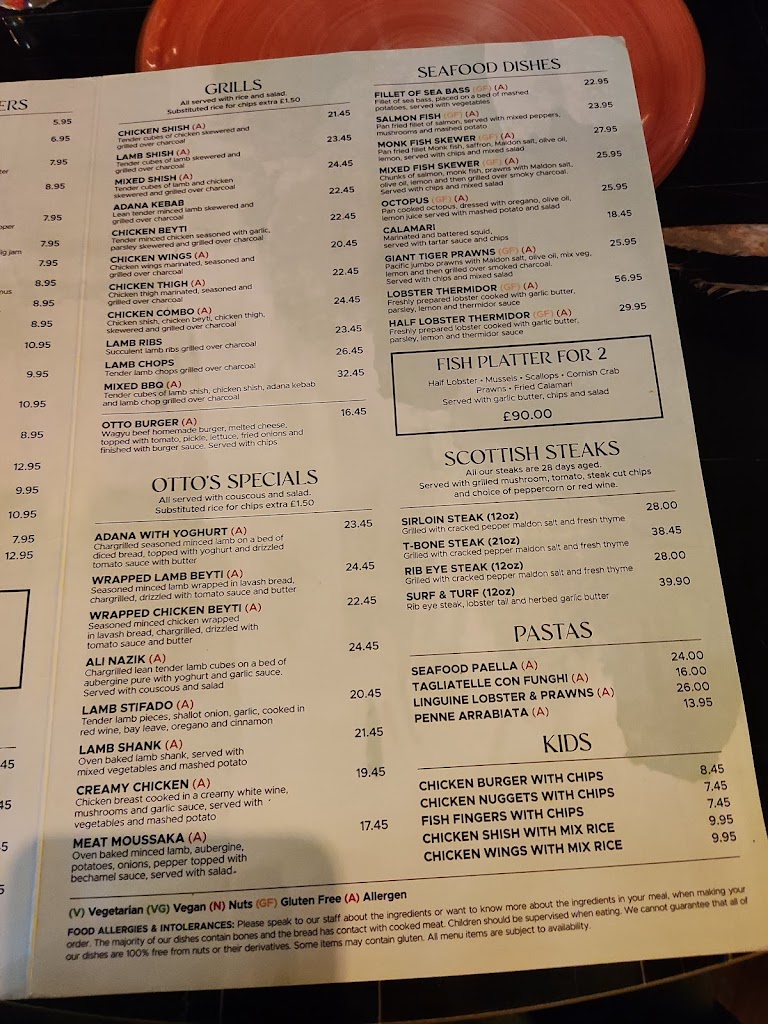 I have been going to ottos for months on a regular basis and have thoroughly enjoyed the food and servive that is until last saturday when we ordered the seafood sharer which cost £90, the lobster was very rubbery to the point we couldnt cut throuh it or break it up. We spoke to the waiter and showed him the problem, he said he would replace it which he did, sadly we had the same problemwhich we pointed out again, the waiter just walked away without a word!!! The prawns were dry and tough we could only eat the squid and scallops my partner could only eat the bread and chips as he was feeling queezy at thus point. The waiters continued to ignore us as we waited over twent minutes for a brandy so we cancelled it and had to go to the bar to ask for the bill. They did not reduce our bill and no apologies were given. Later that night i was violently sick, needless to say i was very disappointed and it will be a long time before i go back, i know they are capable of so much more so but sadly i wont be making anymore recommendations.