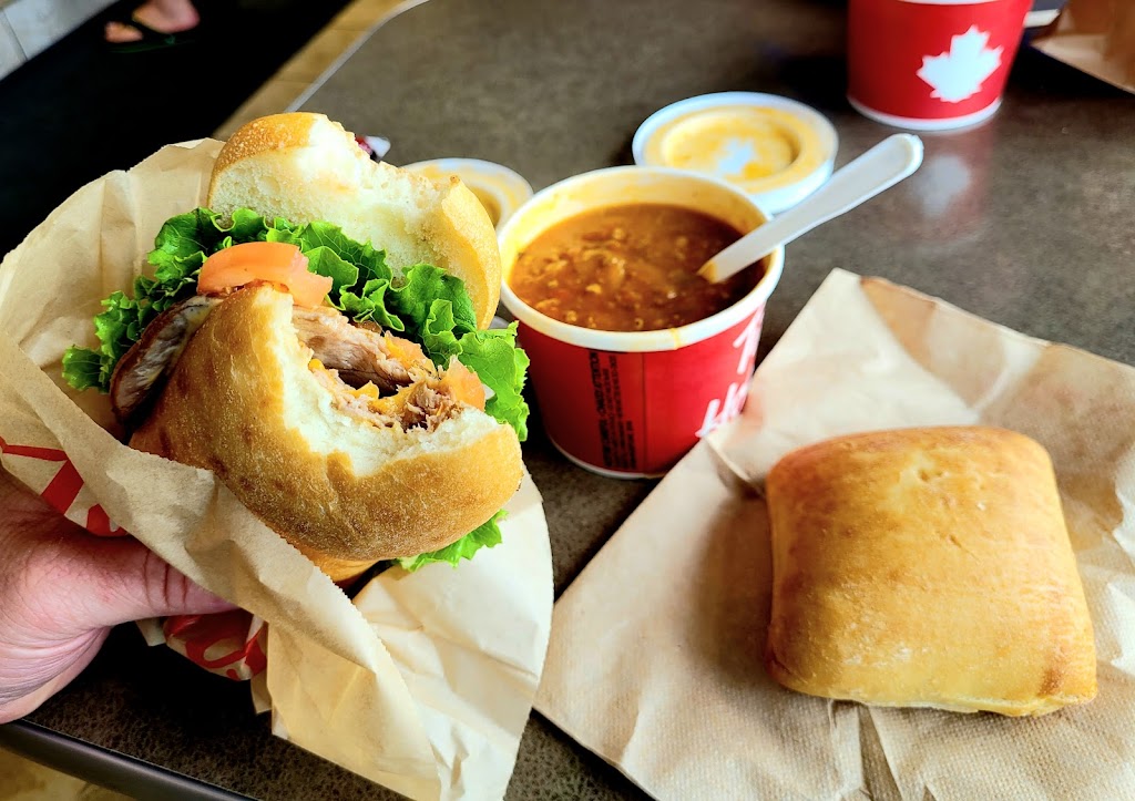It had been a while since I ate a soup and sandwich at Tim's. Roughly 10 years! I wanted a soup and sandwich. I ordered the Roast Beef & Cheddar and a Cream of Broccoli. I received a Roast Beef & Cheddar and a Chili, instead. I could have complained, but I sucked it up and ate it. The bun was very soft and tasty. Unfortunately the roast beef was very bland. No flavor and overly soft. The cheddar flavor was nonexistent. The chili was also very mellow and not that flavorful. I wouldn't order either again, unfortunately.