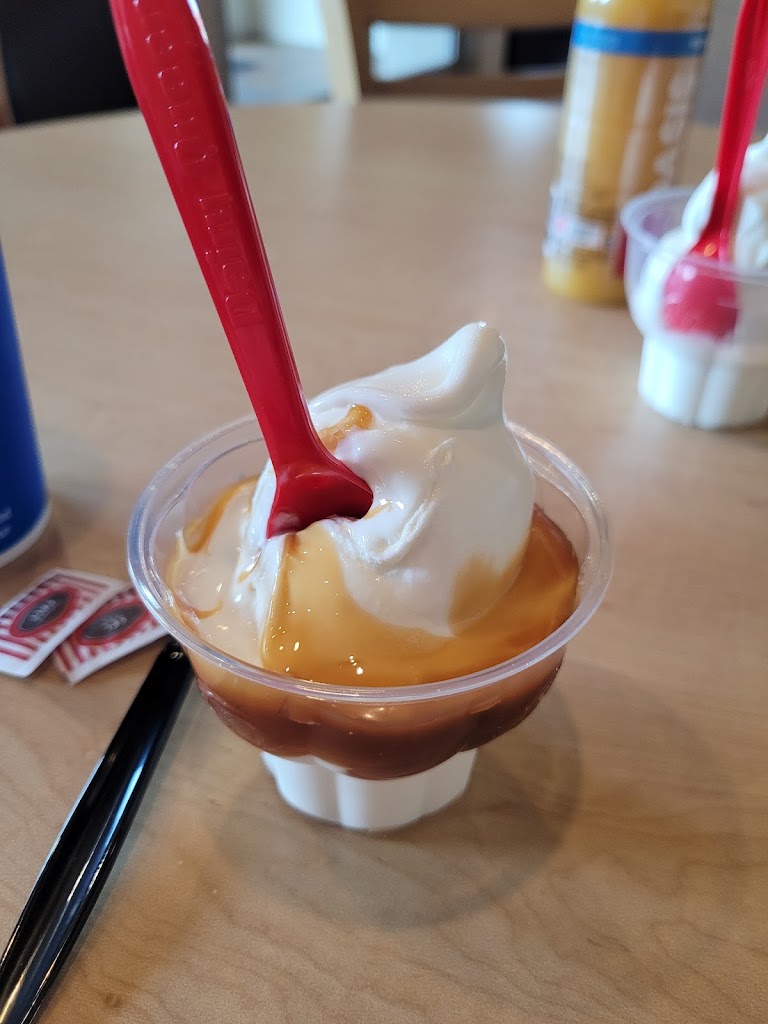 It was a hot day but they gave us our sundae 🍨 before our meal and then my friend was waiting over 20 minutes to get our meals. They were cold and wrong ordered item was received by me. Good thing I am not allergic to anything. Not impressed with the wait time. Our cashier was good. Management was yelling at front counter area at another staff member when he was handing out someone else's meal from the display screen. Not good customer service.