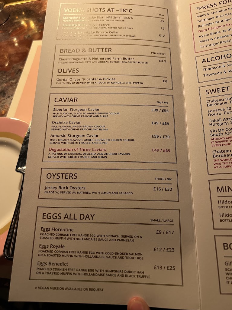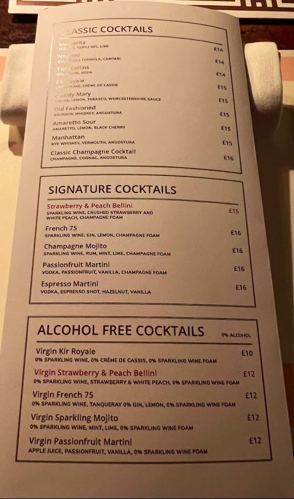 Wonderful lunch at Bob Bob Ricard. Excellent friendly service. Really good choice on the menu with vegan/vegetarian options of dishes that aren’t necessarily listed as Vegan. Lots of virgin versions of cocktails which is lovely. Had a very foamy peach and strawberry Bellini.
