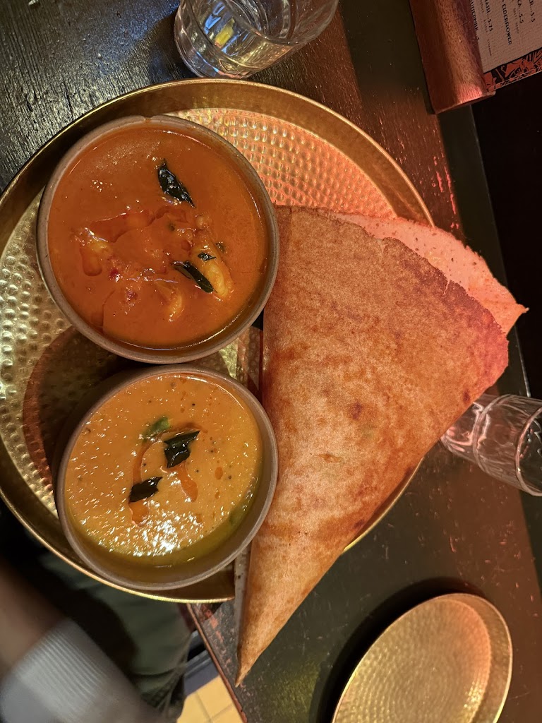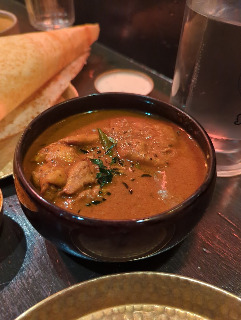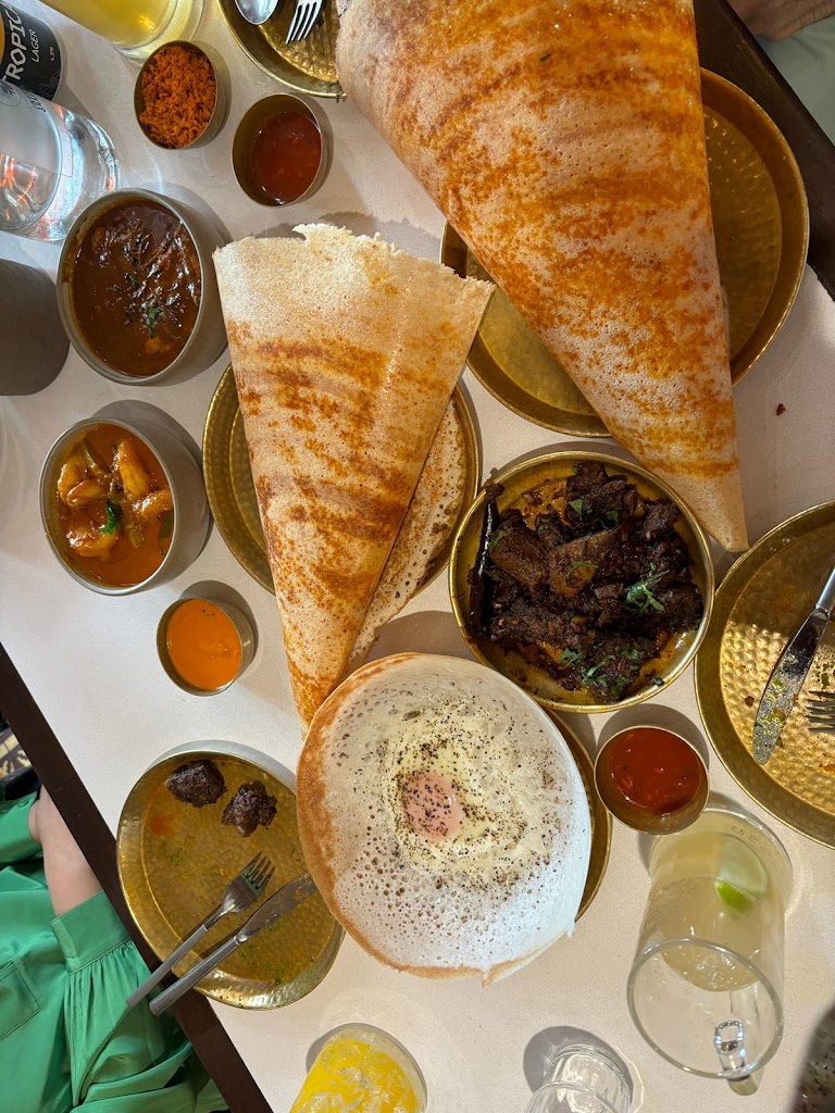 Great food, fast service and awesome atmosphere. Would definitely recommend the Dosas, they were delicious! For main dishes, the chicken Kari was delicious as well as the Bone Marrow + Roti dish. Theres also many vegetarian options, such as the Aubergine Kari, and many others.