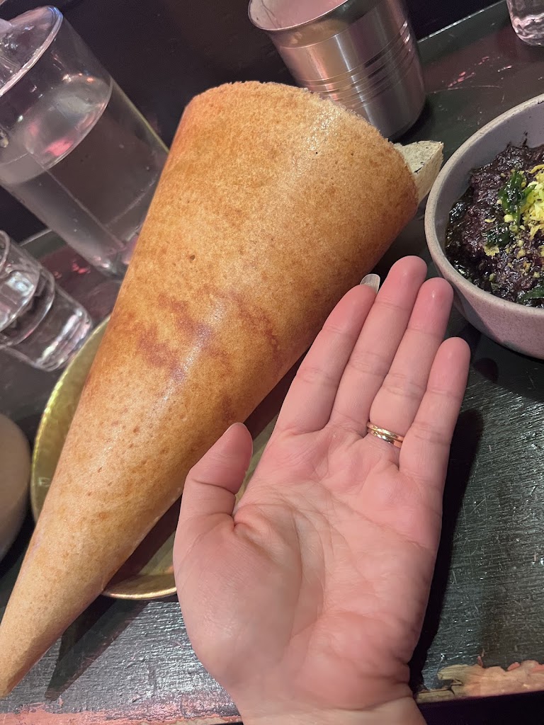 First off Ill say that the food here is lovely. Masala Dosa lovely and light. We ordered prawn kari and lamb kari and both were packed with really great flavour. The portions were a little bit small. But the most frustrating thing about the experience was the speed at which we were ferried in and out. We had eaten our meal, paid and left the venue in less than half an hour. It felt like a cafe experience at restaurant prices. It was an anniversary meal so I was hoping to relax a bit more. Lovely food but dont expect to hang around for the price