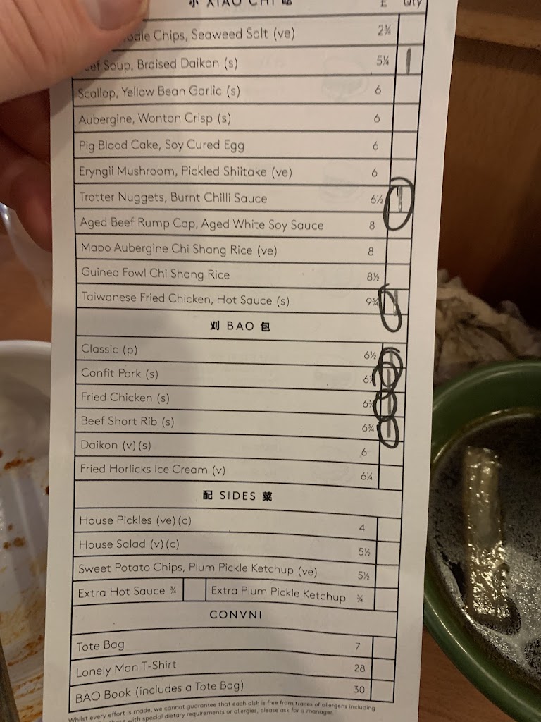 My first time at Bao, I wanted to love it but its all bit of a rip off. I understand high prices for good quality and good atmosphere but this is not it. The food is good in the sense its not bad. Ultimately ita bao buns, which its good regardless but its a difficult food to make EXCEPTIONAL because it is a cheap snack food, on the go, and its main ingredients are made in bulk. The ingredients and fillings are good here (though I found a bone in my Classic Bao, which was a bit sloppy). This location only serves Bao and small plates, and its cafe style, so youre paying on average $50-60 per person (with drinks & service) to eat in a cramped noisy room (and we were facing a wall). One suggestion!! Please put content sizes (ml) on your drinks. At the very least your non-alcoholic drinks!! I ordered the cold brew roasted oolong tea (£4.50) and what arrived was a 200ml glass, half full with ice, and about 100ml of liquid. I was expecting oh I dont know, a decent sized glass? Its iced tea!! I asked the staff to please top me up and make sure the exposed half of the ice is covered with liquid. They topped it up with water. I sent it back saying it was diluted. And then we were treated to a lecture by the staff member saying that is their standard amount, and etc they could not change it because its the standard amount. I said back, hey if you had put the size of the drink on the menu and I knew I was only getting 100ml of ice tea I definitely would not have ordered this drink. The staff took the drink back and made one with less ice and it was fine in the end, but thats just what should have been done in the first place!! We didnt need a lecture, just fix the problem. Thats what service is. So on my last Classic Bao there was a bone in the bao and that just made me feel a bit disappointed about the whole experience. Go here if youve been and you love it and you think its the best bao, fine. But avoid if you want a satisfying experience because this whole experience was unsatisfying in a way I was just not expecting. Vegetarian options: Not a lot of vegetarian options for bao - only Daikon. In the small plates theres a few but they really put the SMALL in small plates. For the price, theres few thats worth it for vegetarians. The aubergine on rice looked good! Only becaue it came with rice and is substantial