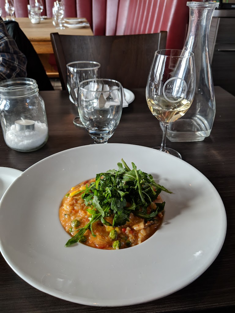 Very cute place and quiet in the afternoon. My brother and father got the soup and fish and chips. They only had one vegetarian option but it was risotto so I enjoyed it. The service was nice and fast enough. The portion sizes were on the small side but my party was full by the end so it didn't matter! The food is rich and flavourful, it's a good place if you're looking for a fancy lunch with a nice glass of wine.
