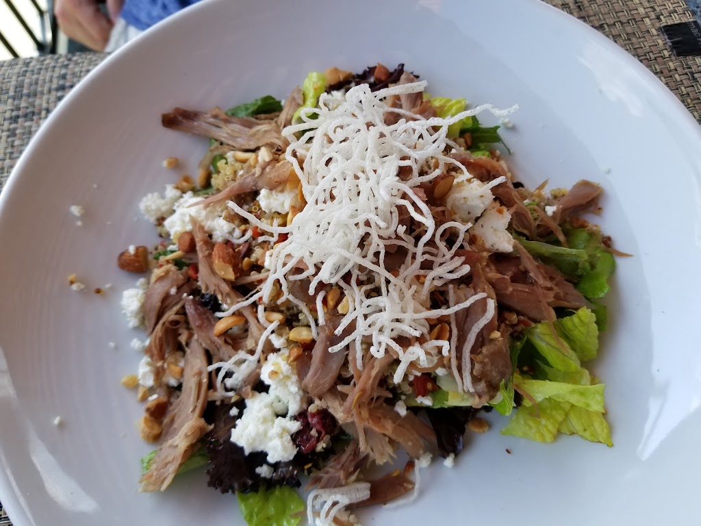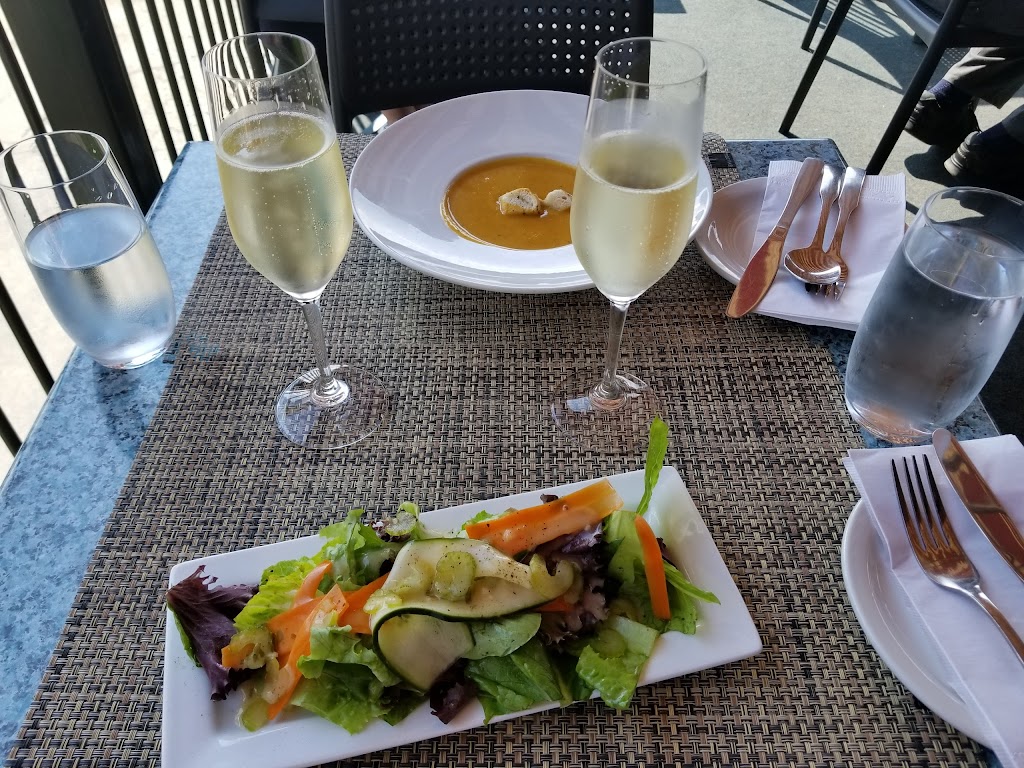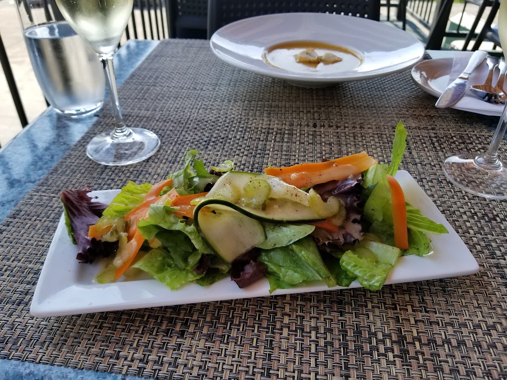 The food and service was great, but the atmosphere left much to be desired. The outside terrace overlooks mostly parking lot, and the local businesses were constantly throwing their garbage out in their dumpsters while we ate. Id recommend eating inside.