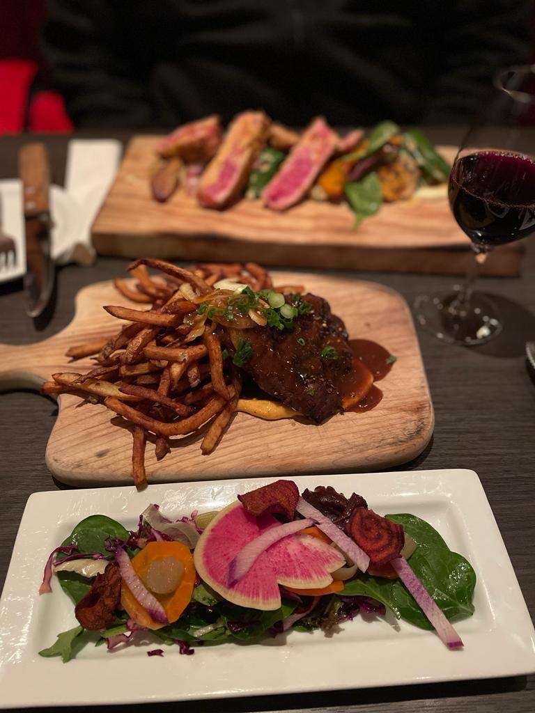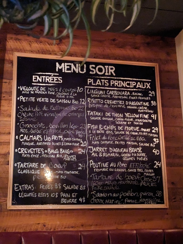 First experience, the waitress overtakes events.. She comes after we have waited 20 minutes, she asks us if we want to order cocktails we say yes and that we also want to order starters she tells us that she does not she doesnt have time to prepare cocktails for a nearby table... Its already starting very badly, a lack of enthusiasm and professionalism, she seems tired even in her tone of voice, no joy. Subsequently, the buss boys, a young and dedicated team, truly rigorous and courteous, bring us starters and constantly fill our glasses of water. We finish our starters and our main courses arrive straight away, we wanted to order wine but the waitress is still not there, I imagine she must be making cocktails at the bar..... The majority of our dishes are accompanied by fries. The oil has long been time to change it, the taste was really disturbing, we just told the waitress and we also had to order our bottle of wine for dinner when our dish had already arrived.. I think so by the way that she was the only one who took orders so I understand her fatigue the owner should be understanding with her and hire more staff the pandemic is not a reason it has already been several weeks that the restaurants have been open to the public. It was the construction weeks Magog is always very busy the owner should have known that.