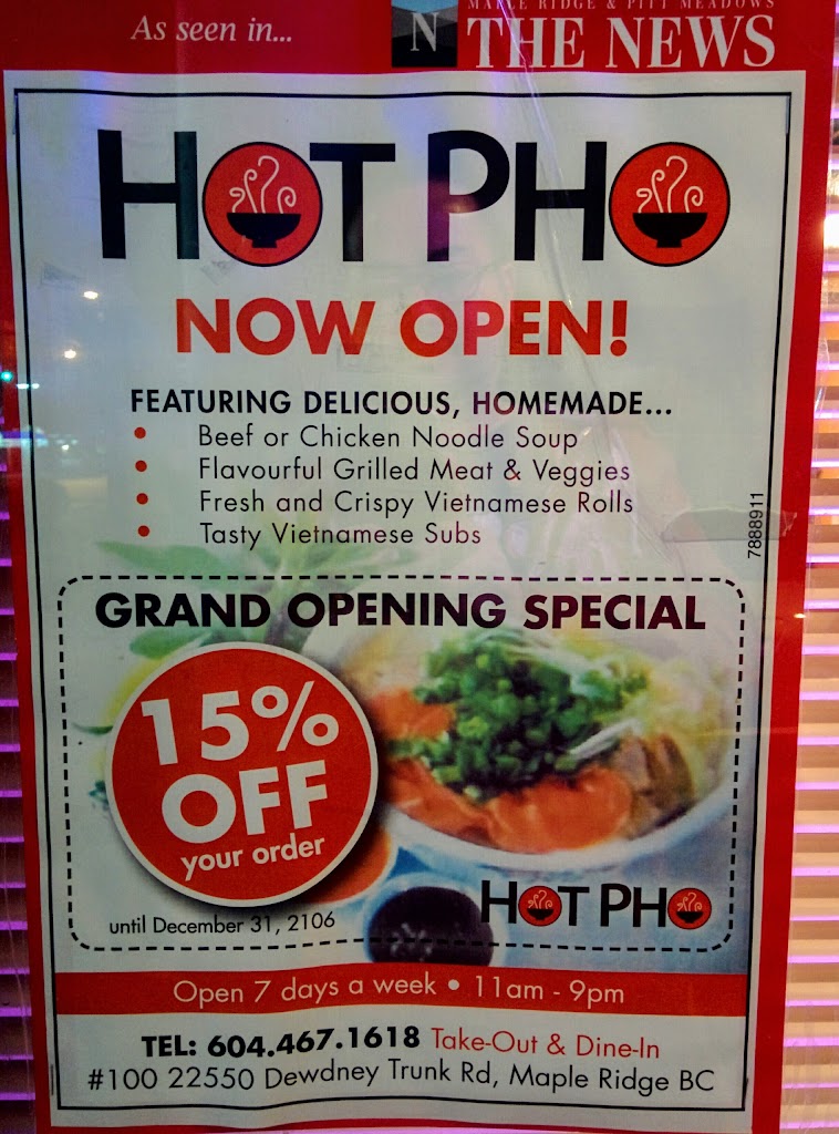 Another great Maple Ridge Vietnamese restaurant, Hot Pho has a fantastic menu with great prices and friendly staff. We really enjoyed the spring and salad rolls, their pho was great too. I had a large bowl of pho but noticed that there wasn't as much meat and noodles as I would normally expect, but I still left full so...overall I would try Hot Pho again. The location is really convenient and parling is great, worth a stop!