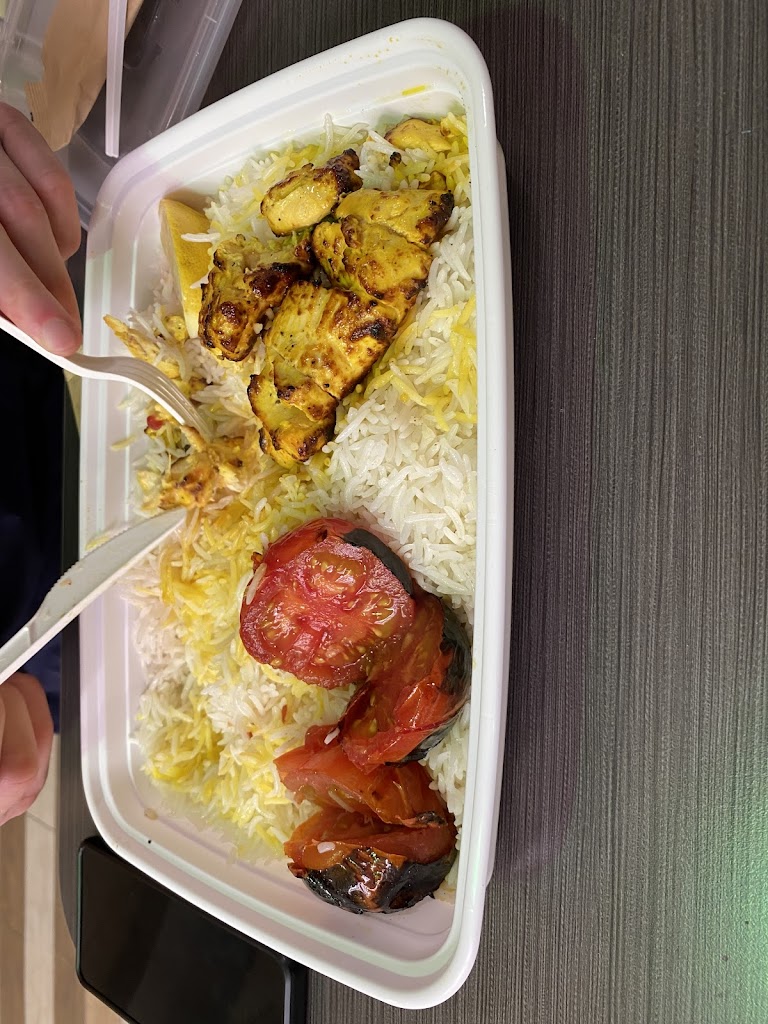 Just had a very delicious and tender chicken kebab with rice and tomato. Everything was so delicious. So much food too. I will be back.