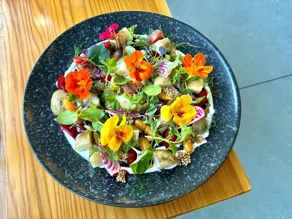 Beautiful setting surrounded with flower garden and vegetable field! Such relaxed feeling sitting outside sipping wine while hearing birds chirping. Their food was indeed fresh, unique, and delicious! We had eggplants that melted in our mouth, gnocchi with crispy edge, and soft and juicy beef we savoured every bite. Wine list was excellent, well thought out to match and balance their veggie forward menu. Wish I had space for a cocktail as well. Every host and server was friendly, capable, and thoughtful. Very highly recommended!