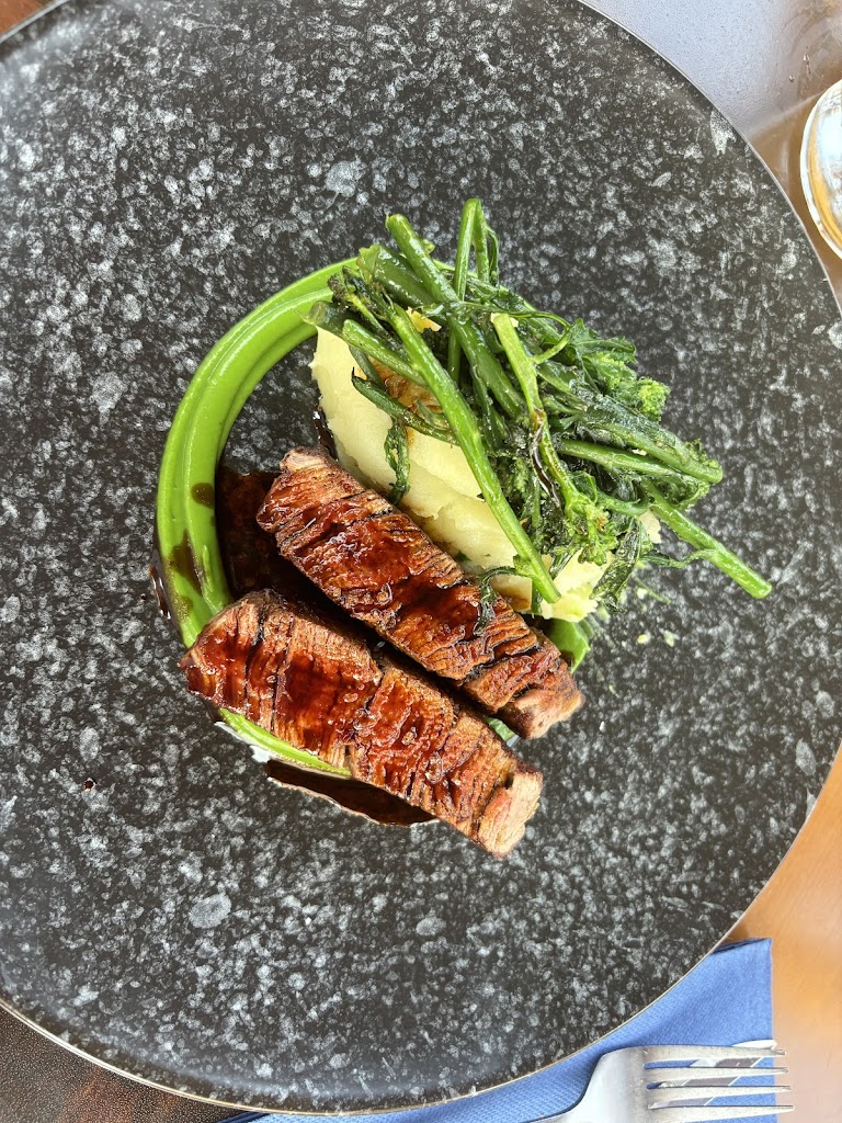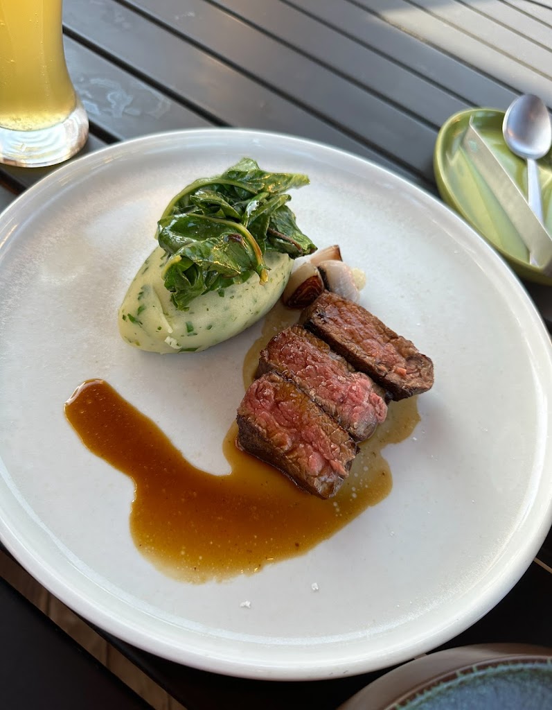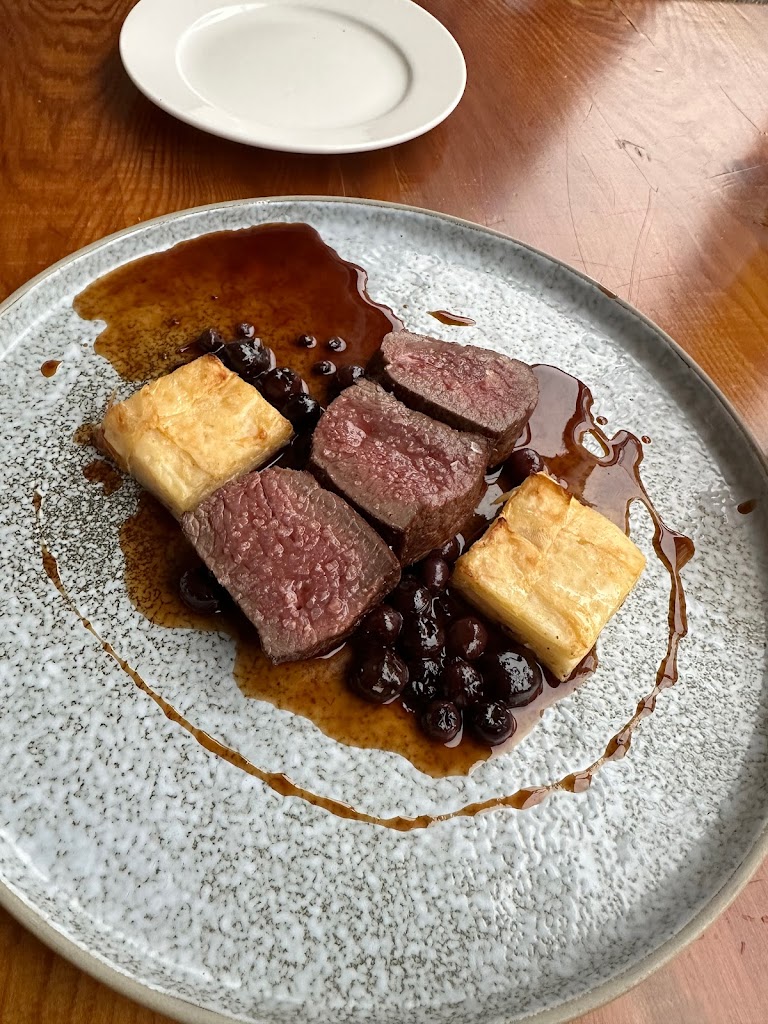 We started with drinks and delicious bread which we dipped into oil and vinegar concoction. We shared 3 different A La carte dishes Beetroot, tomato salad, Beef Tartare. These plates are not large but works for four people. My husband had the Berkshire Pork Chop very nice. Myself and son in law had the Beef tenderloin- very nice My daughter had the house made Agnolotti very nice For dessert we had the poached Okanagan Peaches and the blueberry tart Mmmm! Beautiful presented. The atmosphere was so different and enjoyable. Outside dining what a treat