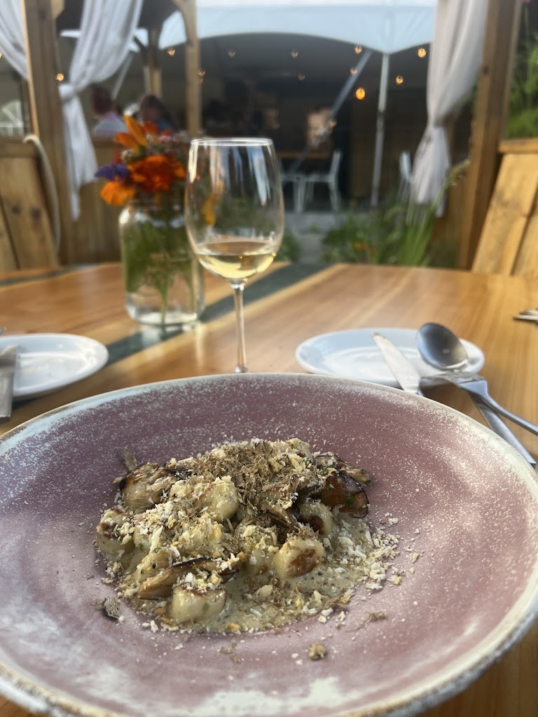 I went for my birthday and the food was DELICIOUS and such a wonderful experience. It s a farm to table concept with crops grown just steps away which is so cool. We got the kale salad and the cauliflower to start with and halibut and the gnocchi as mains. I would 100% go back for the kale salad and gnocchi alone. For dessert, we go the corn cake/bread? It was just okay. We wanted to get the other dessert but due to dietary restrictions we couldn t get it. Also we went in the evening and it was quite chilly! Instead of drinks we got tea and they refilled our mugs with hot water when our tea got cold. They also provided us with blankets which was nice! 10/10 recommend this place.