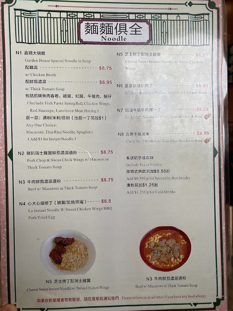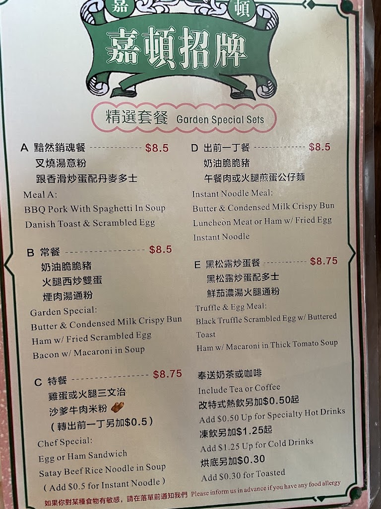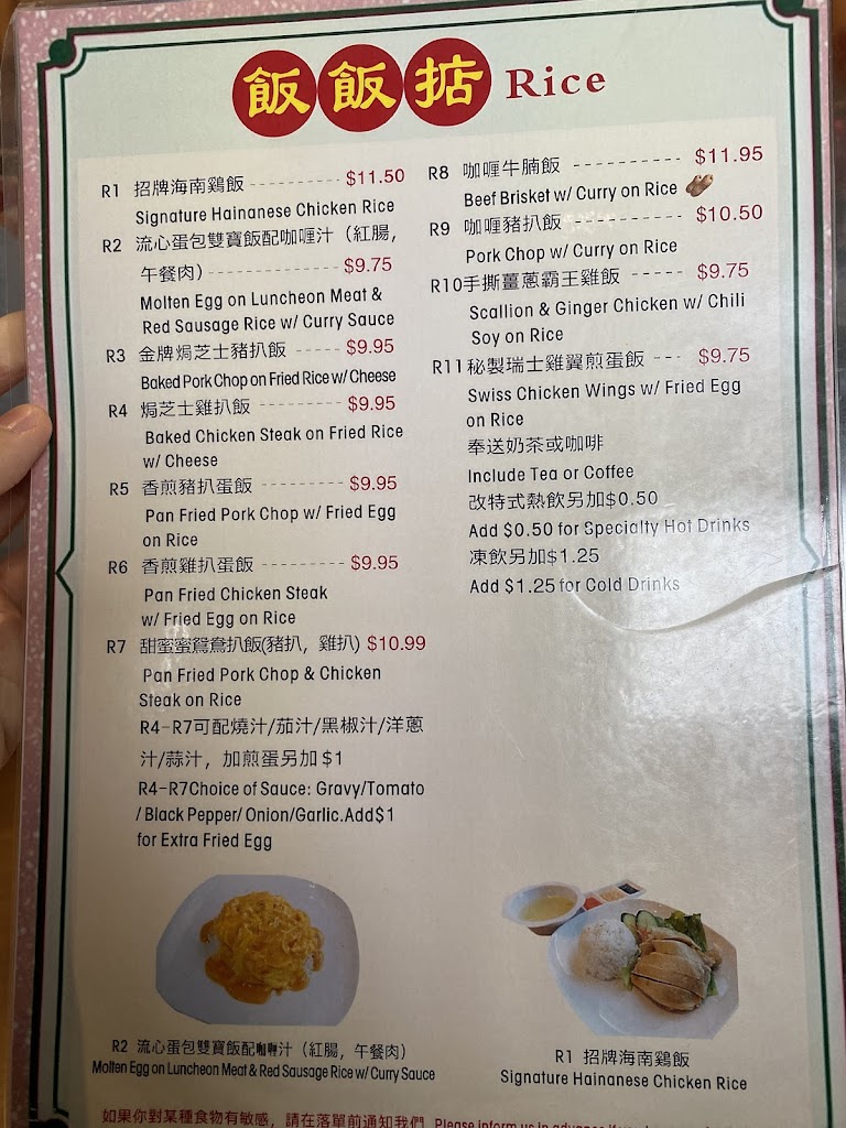 Really good prices I got the hainese chicken rice. Everything was well priced and a good amount of food. If you struggling financially in life and want to treat yourself go get some cheap and tastey hk style Cafe food