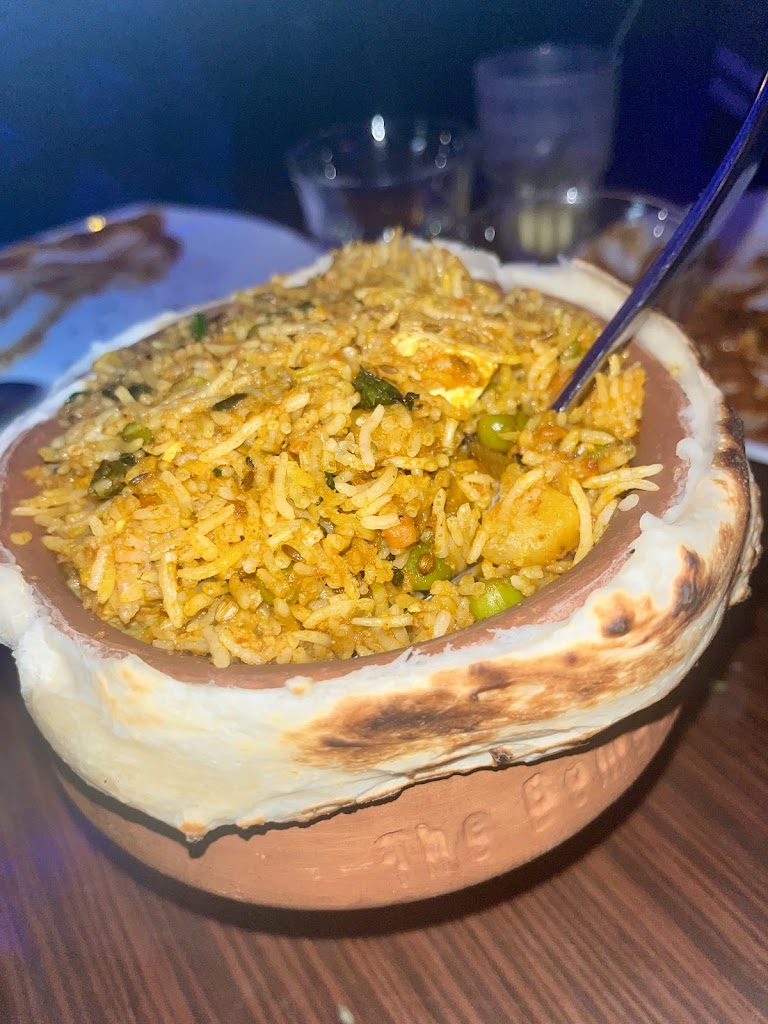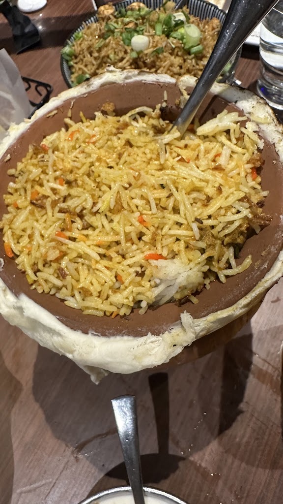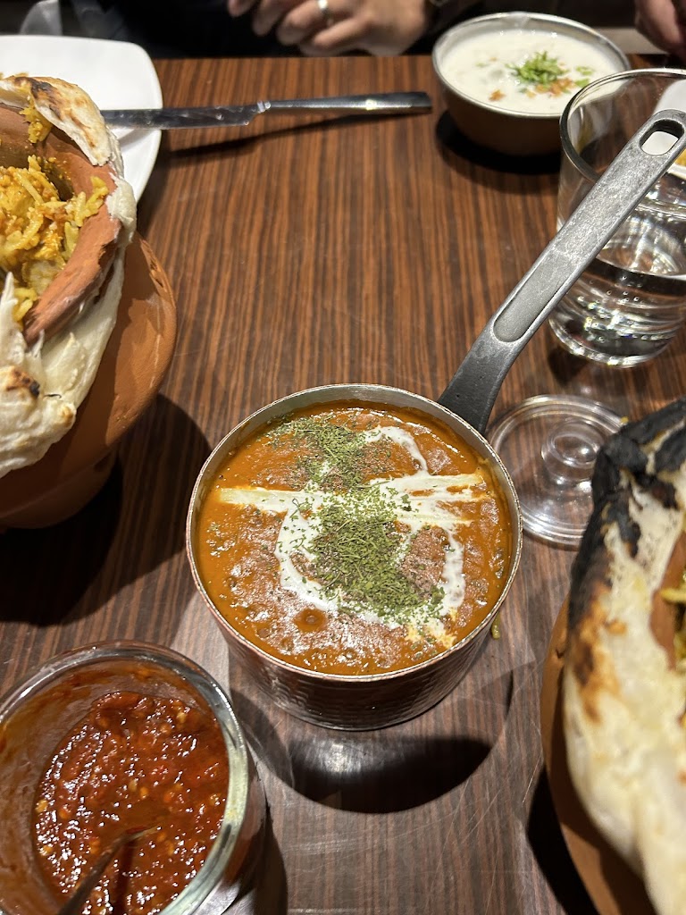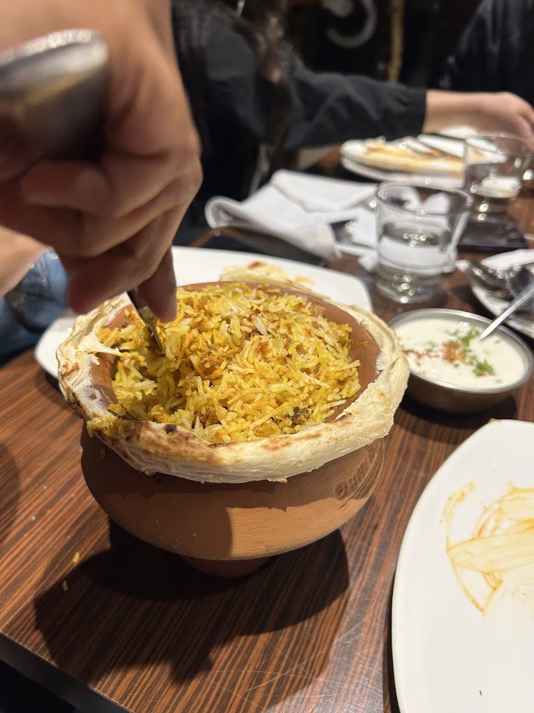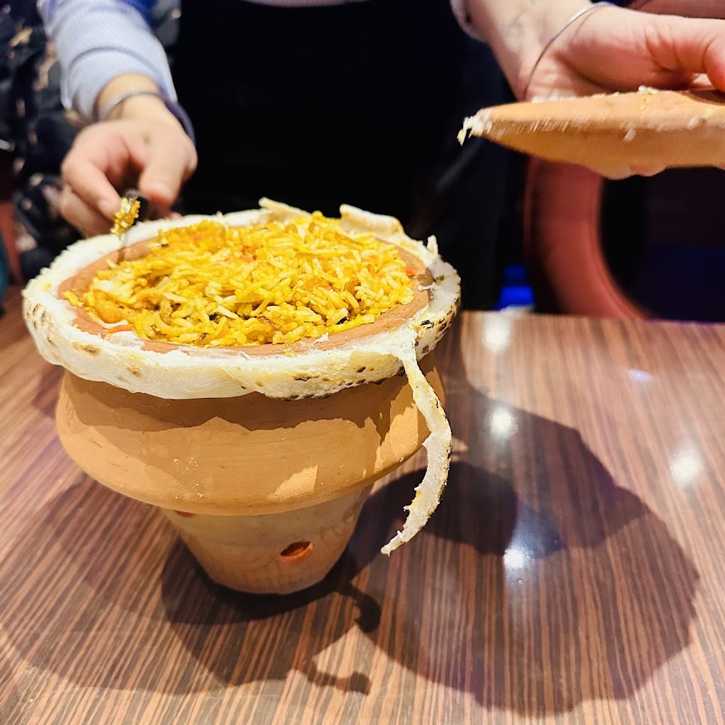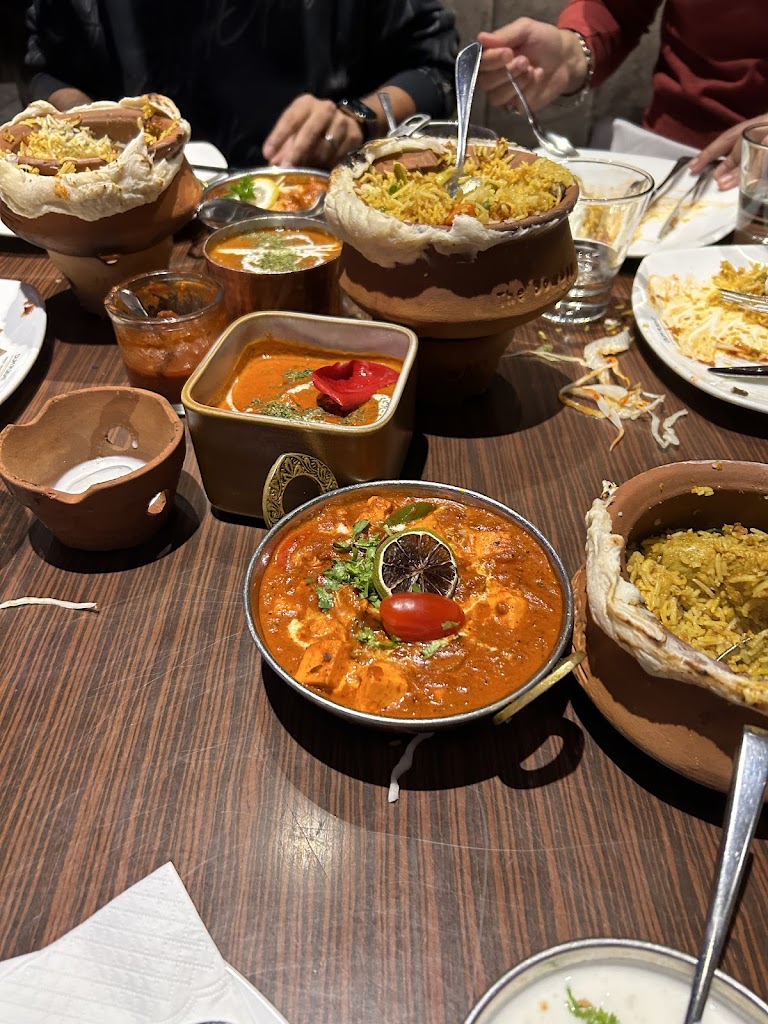 We got the rara chicken, dal makhni , pindi and the vegetable dum biryani which were all great. The vegetable dum biryani arrived fresh in a clay pot sealed with dough which was very impressive. The pindi lacked some flavour but wasn t terrible. The waiter who brought it to us opened it and set it aside for our serving. We were more impressed with the quality of service. Our water was always filled, they gave us a small cake to celebrate a birthday and even packed out leftovers for us.