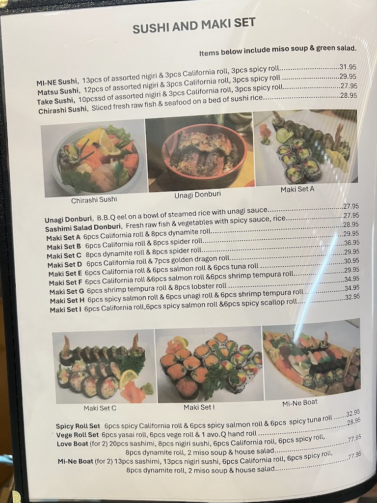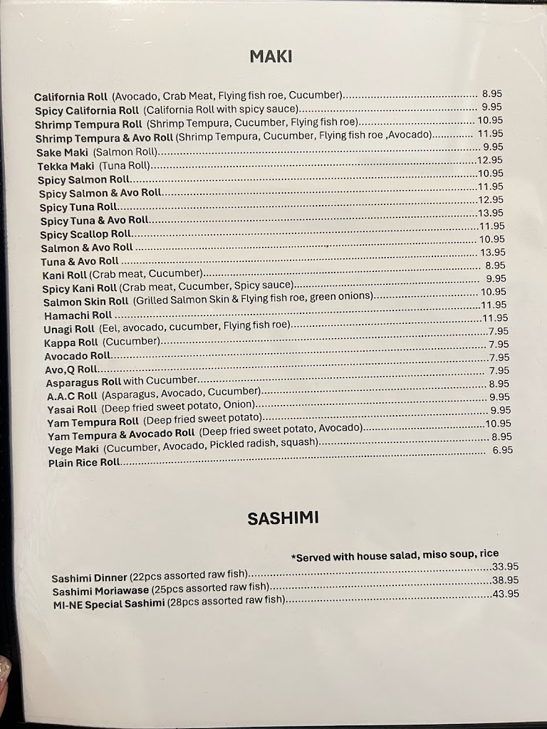 Decent quality and quantity. You get the occasional oddly shaped piece of sashimi though. They do have a cash discount for dinner (5% off your bill). Make sure to mention that you are paying by cash when you ask for your bill. Edit (Dec 2023): The quality is the same but unfortunately the prices have gone up too much. Mi-Ne used to be our go to place for our family but it is just too expensive for what you get. I ordered a Red Dragon roll and they only had one thin slice of tuna on each piece. Although we got there around 6:30pm, it took at least 45 minutes for us to get our rolls. Even when we asked for our bill, it took a long time for them to get it for us. I will say that the waitresses were really nice though.