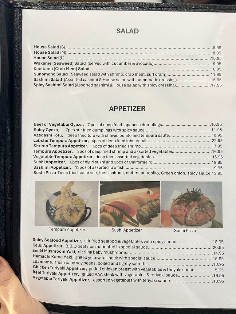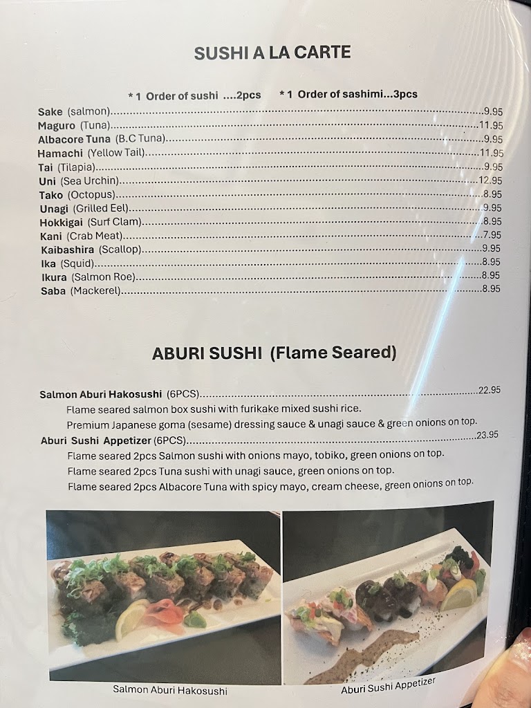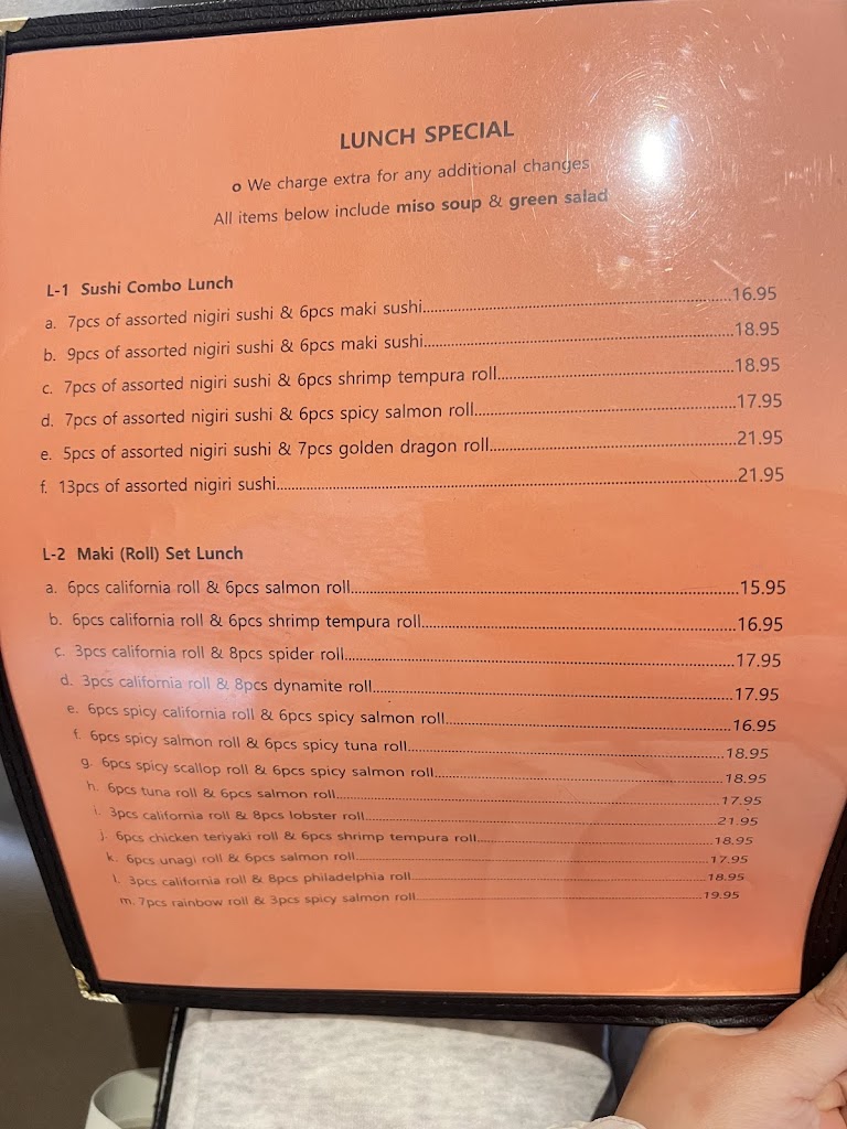 Big menu, lots of options. Servers were nice. Fish was very fresh tasting. However the rolls are cut waaaaay too big and thick, both for the basic and specialty rolls. Each piece was the size of 2-3 normal pieces. It honestly wasnt enjoyable, it was just too much in 1 piece and you cant fit the whole piece in one bite so you couldnt get all the flavors in together. I wont be coming back unfortunately because the roll sizes. Ive never seen pieces cut so big
