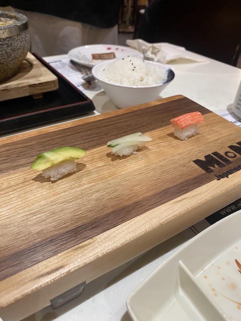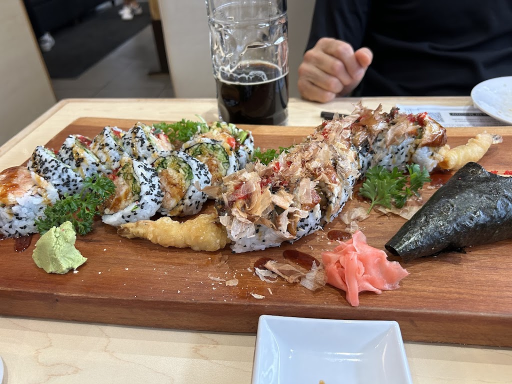Delicious, fresh sushi. Strongly recommend the Tuna Lover Roll (middle one in the photo) which was our favourite. We also loved the jalapeño sushi bombs, which I did not take a photo of. We had the lobster roll, tuna lover, & sashimi salad roll. Our least favourite was the sashimi salad roll, but it was still good and fresh. And their miso soup was absolutely delicious. Super rich and was hard not to order a 2nd bowl! Best paired with a cold Asahi beer!