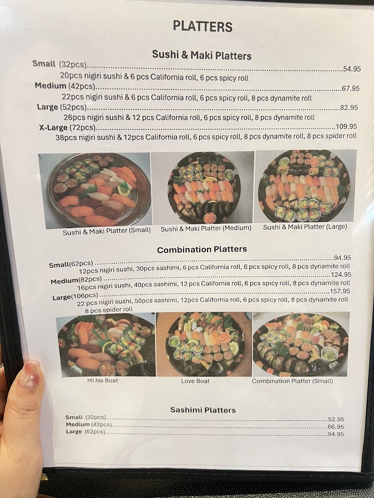 What An amazing sushi restaurant I tried today. Some of the best quality and freshest fish I ve ever had!! I went with a group of friends and we couldn t decide what to order individually so we opted for a massive platter. I believe it was 110 pieces for $160, fair pricing considering the quality. It came with variety of sashimi, sushi and rolls. Even with 4 of us who can all eat a lot we still couldn t finish it. But still amazing nonetheless!