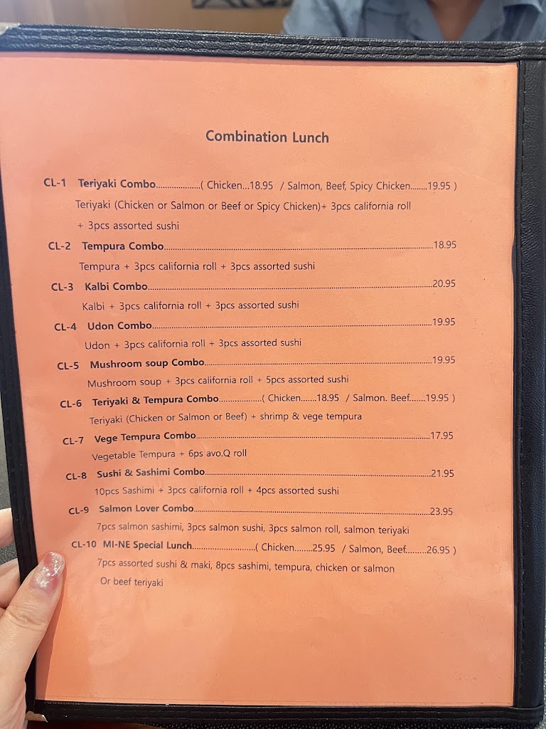 I have been coming to MiNe sushi for over 10+ years. I dont live in the area and I dont mind the 30 minutes drive for dine in or take out. They always provided me with good service. I did take out yesterday. The quality of the makis were very fresh and the size of the rolls were big (whereas everywhere else things are shrinking). Each roll was heavily loaded with ingredients and right amount of rice. (Some places give you too much rice and little fish). Overall we had a great dinner. We ordered: Salmon zen combo Green dragon roll Crazy crab roll Dynamite roll, Yam tempura roll Caterpillar roll Richard rainbow roll