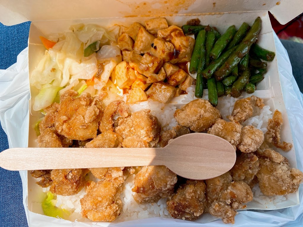 Taiwanese style popcorn fried chicken with 3 veggie sides for $13. This is a quick take out spot (not seating) with different meat and vegetable options that change daily. Food : 5/5