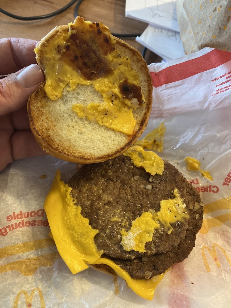 So disappointing, theres nothing in it..quarter pound meatball 3 onions, 2 pickles, and really no sauce, leftovers taken from George... I have my McDonalds trip empty. What can we say about lunch...bacon mc muffin...it gives you dry English muffins that will break your teeth. You say to yourself, Im going to leave it dry... well, hug it out, you realize that the egg disintegrates because its not cooked... its hard.