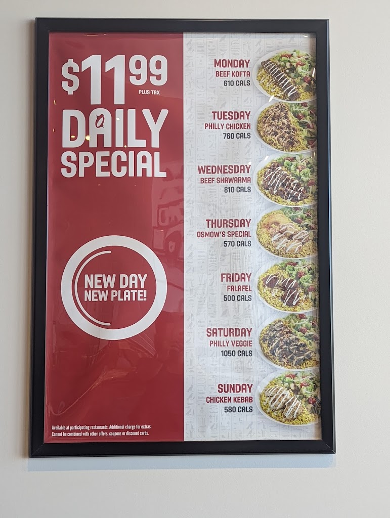 My wife and I first heard about Osmow s Shawarma from watching the Toronto Raptors games and we were excited to try it. It looked really good and much different from the normal fast food that we have and now we have one in Medicine Hat! We certainly weren t disappointed! The helpful staff came out from behind the counter to explain how it worked and what everything was. Now we are Osmow s Shawarma pros! Osmow is an Egyptian Canadian from Toronto and he has a really great Canadian success story. Read about his journey on the wall art in the store. My favourite is the chicken shawarma mix of half Caesar salad with pita chips and half rice, with the chicken shawarma. I choose medium spice, garlic sauce and the beautifully pink, pickled turnips. It is incredibly balanced, delicious and just the right amount of spice. Get hot if it is too mild for you (but it is very spicy), or mild if you like less. The mango juice goes great with it and cuts the spice nicely! They make great wraps that my wife loves too, or get it on fries instead of rice or a Greek salad. A fantastic Canadian alternative to fast food! It s always fresh, tasty and they make it to order. Clean and tidy restaurant, helpful, friendly staff and great, flavourful food! Check out Osmow s, you ll be glad that you tried it and you will be back! Vegetarian options: Falafels, vegetarian friendly with lots of options. Dietary restrictions: Ask staff, lots of options. Parking: Lots of free parking. Kid-friendliness: Mild for kids, fries maybe, depends how adventurous they are or if they like spice. Wheelchair accessibility: Accessible.