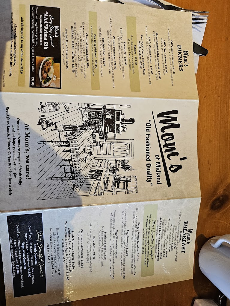 Hello guys this is my honest and truthful review of Mom s Restaurant. Please know that this review is my personal opinion and isn t to bash or disrespect in anyway shape or form Mom s. Mom s is a restaurant staple in Midland! It has been around for ever! Amazing owners, family run business that cares about community. On that weekends this is the place to go. My wife and I went this July long weekend on the Monday. It was a normal busy day but something was off something felt differently. Seemed like the kitchen help wasn t really on the ball or maybe things have changed. We sat down order chicken clubhouse $17.00 with fries and Mom s grilled salisbury steak $23.00 thinking like always we couldn t go wrong and we re excited to eat. 45 minutes later our food came out! My wife s fries were completely cold and my plate looked like it was for a 10 year old. My wife asked that she have new fries because they were not fresh like they had been left under the heat lamp for a while so the server brought another plate within seconds. Well they must have come from the same heat lamp. She again asked can I actually get some hot fries please. He sandwich was average at best. Finally, the hot fresh fries were here and we could start eating. My plate on the other hand had a small ice cream scoop of frozen veg and mashed potatoes with a little gravy on it. The salisbury. Steak was homemade but over cooked and burnt. Lucky the little gravy they put on it made it edible. Mom s is a great restaurant that used to give great portions now it seems it s about the smaller you can give the better. Mom s makes good food but cheap on delivery. Our bill was $68.00 for something that really was worth $40.00 with tip. I feel Mom s is running off old reputation of quality food, but most of all quantity food for a good price. Is it home quality food? Not at that price. There are other restaurants that will fill your plate in Midland instead of making you walk away hungry! Disappointed but maybe the owners have lost that drive to put out plates that they would be proud of. Again, great restaurant but price point is way beyond quality and quantity of food. Might be time to look elsewhere for breakfast or lunch options because Mom s isn t at the top of the step anymore, but three steps behind.