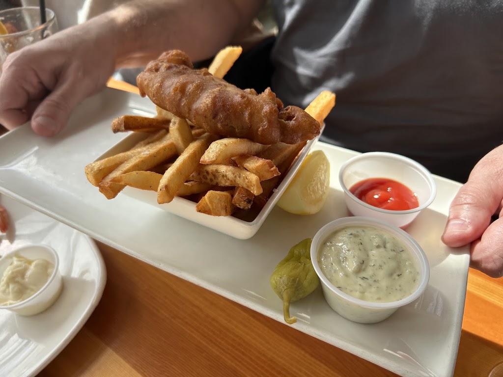 The coleslaw was weird, had mint in it or something. Fries were acceptable but not amazing. Fish was heavily battered, didn't seem like enough fish in the fish to batter ratio. Can't beat the view and cool interior. There's a bar and TV to watch sports etc. Service was slow to get food, waitresses were nice and kind to my elderly mom.