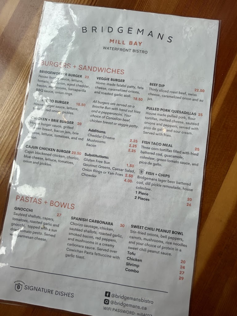 Were on the Trans Canada 1 heading towards Victoria. We ended up at Bridgemans Bistro in Mill Bay after a short detour. The food was absolutely perfect 1x fish and chips and 1x fish soup. Not a long wait, great view, very friendly service. Anyone who is nearby should definitely go there. Only our little dog wasnt allowed in. (unfortunately this is the case everywhere now).