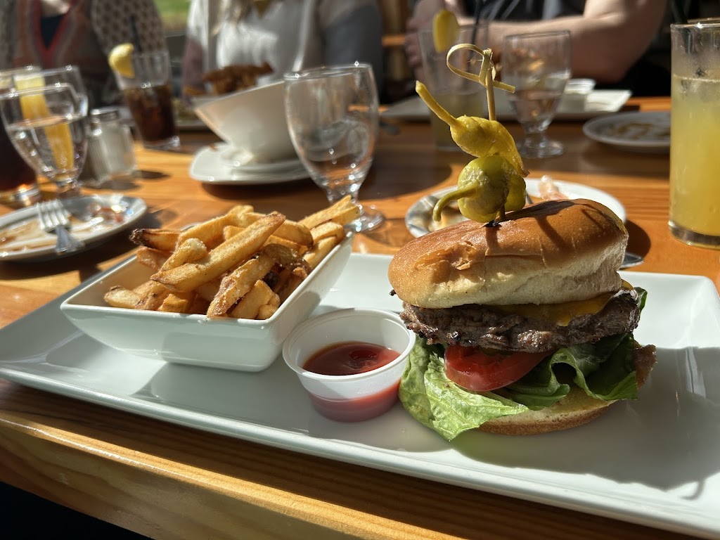 Went for my bday lunch with my Mom. We were seated outside on the patio. Nice vibe but the chairs looked like they were dug up from the sea bed. Very uncomfy. We split a burger and had a beer and a ceaser. Food and drinks were great. Service also good! Best French fries I have ever had!! Food