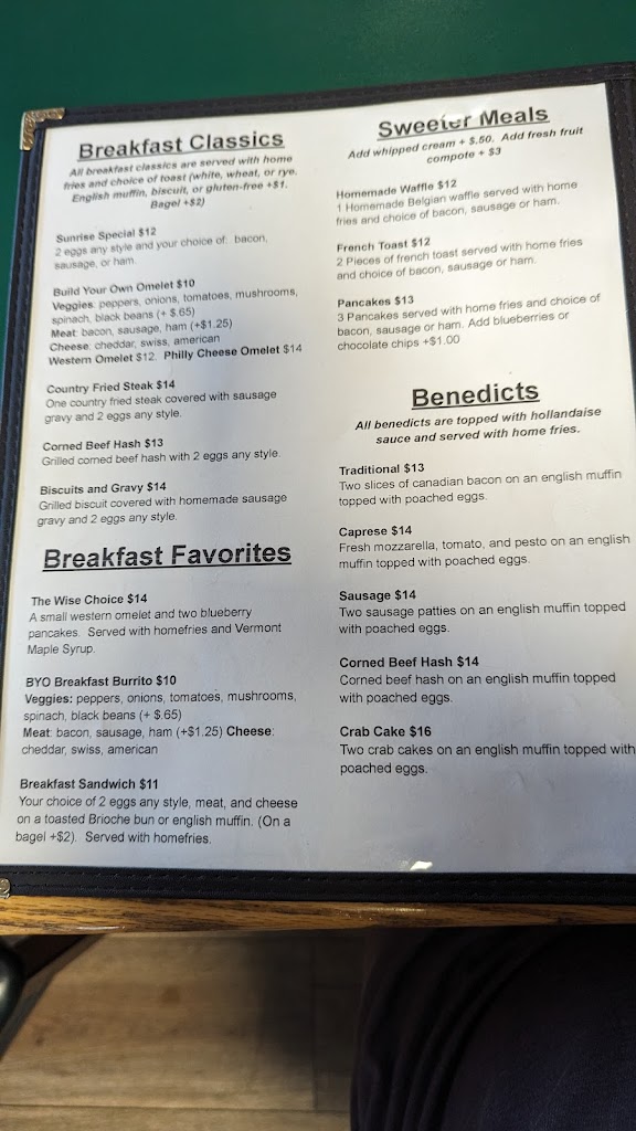 This place is a real gem! You know that you are in a local diner when there are Polaroid photos of the regulars framed on the walls. Very affordable and great value. Big portions - the side pancake was bigger than the platter that it came on! For $0.65, they stuffed the pancake with so many blueberries! It was 50% purple! I bet they were even local blueberries! We each got a Benedict and my corned beef Benedict was amazing. The yolks were golden and thick and it was not too salty. My wife got the two crab cake Benedict and even though I am a Maryland crab cake snob, they were legit! The staff gave genuinely friendly local service. I hope we get to return to this cute little diner on our way back to the airport in Burlington, Vermont!