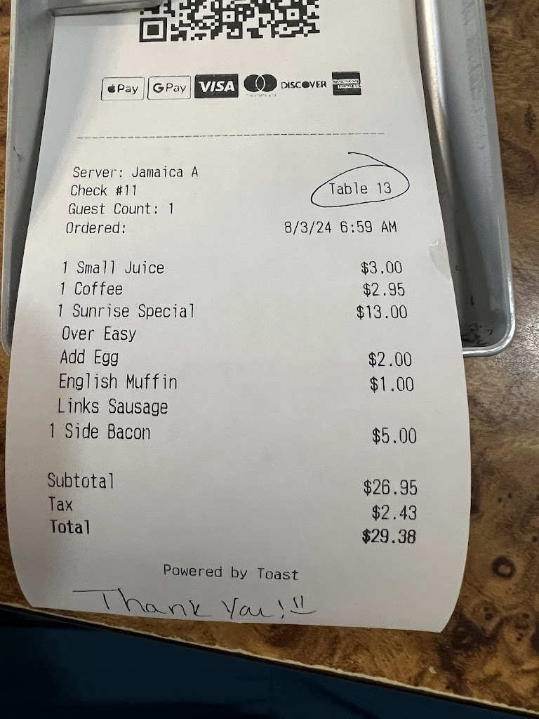 Had a great breakfast and server. Had there pancakes but have to ask for additional syrup.