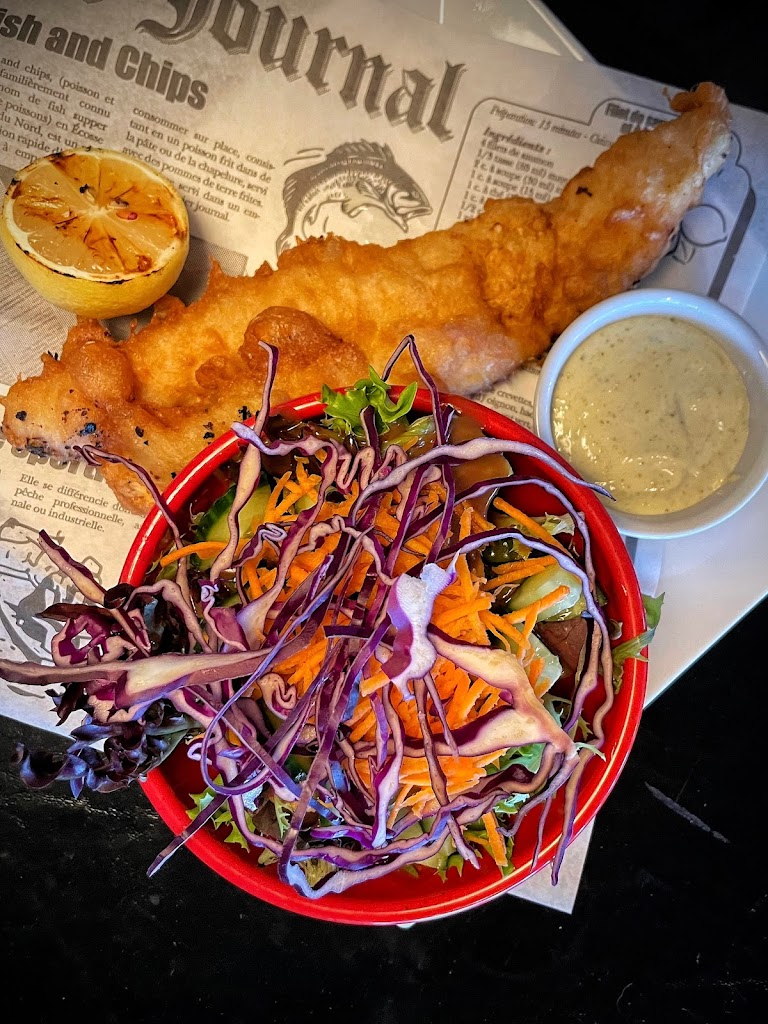 Very big venue with an industrial, casual feel, a nice patio and great for large gatherings. Beware, the music is loud and makes it challenging for regular conversations… The food was hit and miss. The pulled pork sliders were okay, nothing to rave about, and a bit on the cold side. The bacon bonbons were highly recommended by the server and described as braised pork belly that melts in your mouth. Unfortunately, the ones I received were cold to the touch and very tough to eat. The server did bring me another serving (hot the second time around) but still very dry and tough. After eating one of the pieces, I opted not to finish the plate. On a more positive note, the fish and chips was tasty. Surprisingly not the usual cod but walleye was on the menu. A large portion was served and the ratio fish to batter was good. The salad was fresh but drenched in balsamic dressing. Finally, the service was good. Our server, Marie-Eve, was very friendly and attentive to our needs. Based on my experience, this is probably a better place to enjoy a flat of beers at the bar than food.