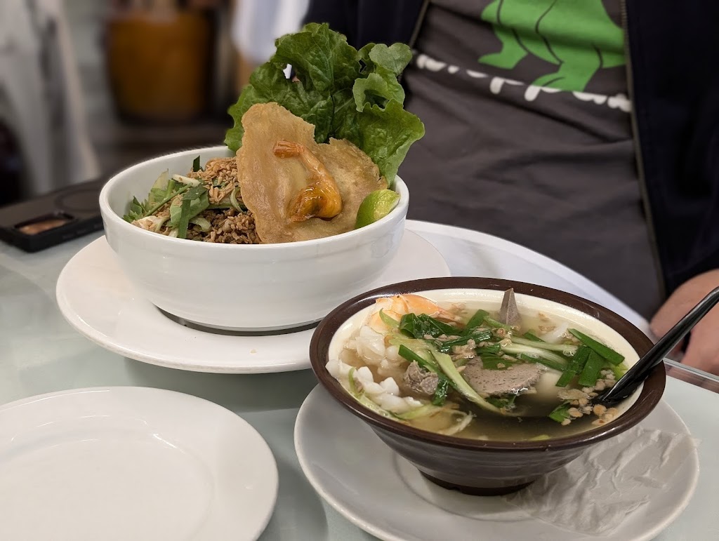 Don t miss! We ordered the same food as last time and didn t realize it: 1 Pho Ngoc Yen Dac Biet = NY Special: rare beef, beef balls, boneless beef shank with rice noodles and H2 Hu Tieu Do Bien = clear noodles with seafood and papaya salad. We would have ordered more to try other dishes but the portions are so generous that we have a hard time finishing what we ordered. Packaged to go the broth is separate from the noodles beef balls and seafood were in the broth but the rare beef and beef shank were packaged separately with a large bag of mung beans and basil and 2 lime slices. NY Special is full of tons of tasty meat and wonderful broth. Clear noodles with seafood was great with a good amount of medium size shrimp and scored squid but the crab meat was disintegrating. The papaya salad had the fermented crab in shell there was a lot of small crab but we were able to eat around it as the pieces were bigger than last time wish they d make it without the fermented crab because it s an excellent dish otherwise. Can t wait to eat here again!