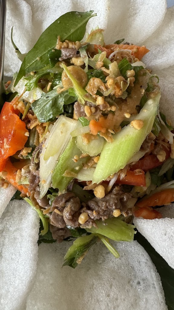 Probably my new favorite pho spot. Broth is rich in flavor and beef is good quality. Use thin dry noodles. The coconut sticky rice is very nice and the chicken wings with that sauce is so tasty. The porkchop with egg on rice dish is a terrible choice. The porkchop is drier then the Sahara desert. Mango salad is nothing special. The Pad Thai i found a lil to sweet for my liking. I didnt try the fresh spring rolls, but they look super basic. Decor is beautifully done, I felt like I was in a small village in Vietnam. Service is excellent. Washrooms are clean
