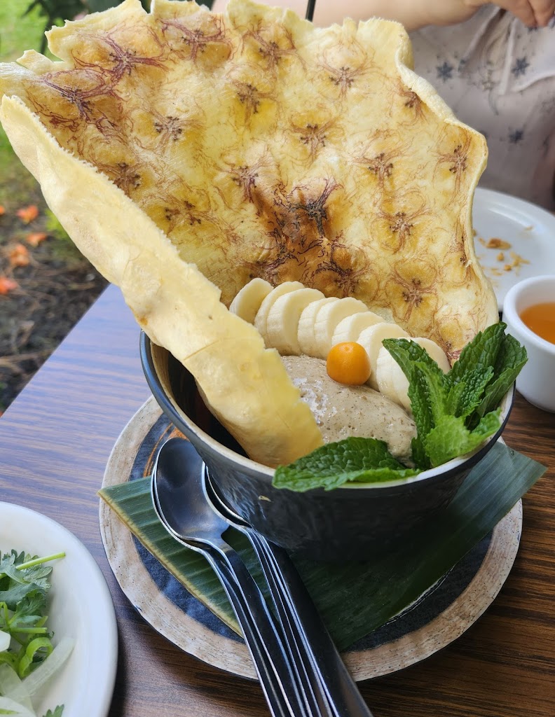 Had a fantastic weekend lunch here, menu had a lot of variety with several unique dishes. As appetizers we had the chicken with fried rice cake which was amazing, and the mango salad which was good but standard. The large pho came with a generous amount of meat, and the broth was flavourful. We had the banana trio dessert which had a very cool presentation and was fun to share. Definitely the dessert to get. Service was friendly and had great answers to our questions. We were fortunate enough to get a table outside in lovely weather. Prices were very reasonable.