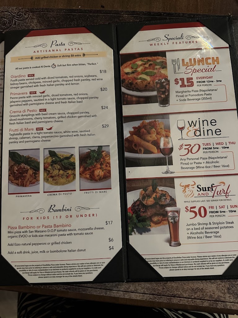 Dining at Goodfellas Wood Oven Pizza was an absolute treat. The aroma of freshly baked pizzas greets you upon entry, while the cozy atmosphere adds to the charm. The pizzas, prepared in their wood-fired oven, boast a perfect balance of crispy crust and flavorful toppings, making every bite a delight. Overall, we had an amazing experience at this place.