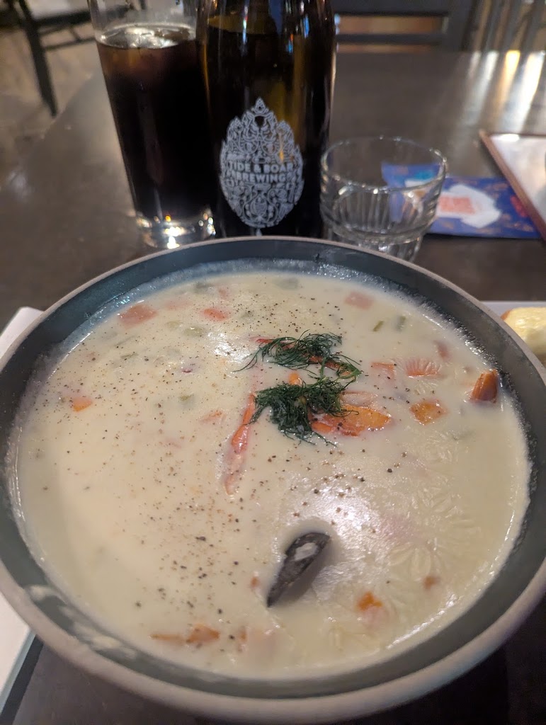 I am in town for business and I was looking for a place to get some comfort food. The Tide and Boar was within walking distance from my hotel and it looked to fit what I wanted. I came early for dinner and was greeted warmly and seated right away. I saw the v seafood chowder on the menu and asked about it. I was told it was a meal itself and was really hearty. The server was NOT kidding. A huge bowl of chowder was brought to my table with a thick slice of bread with butter. It was absolutely filled with lobster, mussels, shrimp and more! It was so good and really hit the spot. I was really full when I left and completely satisfied!