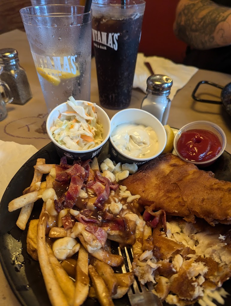 Fish and chips and Brisket Burger. So delicious. We were stuffed so we bought a cheesecake to go. Definitely worth the price. I love the atmosphere at Montanas. It wasn't my first time and won't be my last.