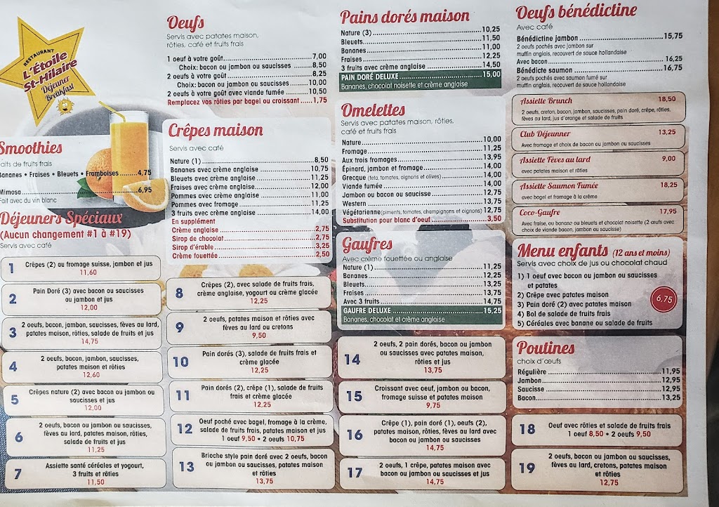 Jai été plusieurs fois à lÉtoile depuis quelques années.A chaque fois, jessaie quelque chose de nouveau en espérant aimer le repas.Jai apprécié le poulet et desserts mais cest tout.De plus, le service est TRÈS lent nayant souvent quune serveuse certains soirs.Je ne recommande pas même si cest le seul restaurant familial à MSH.