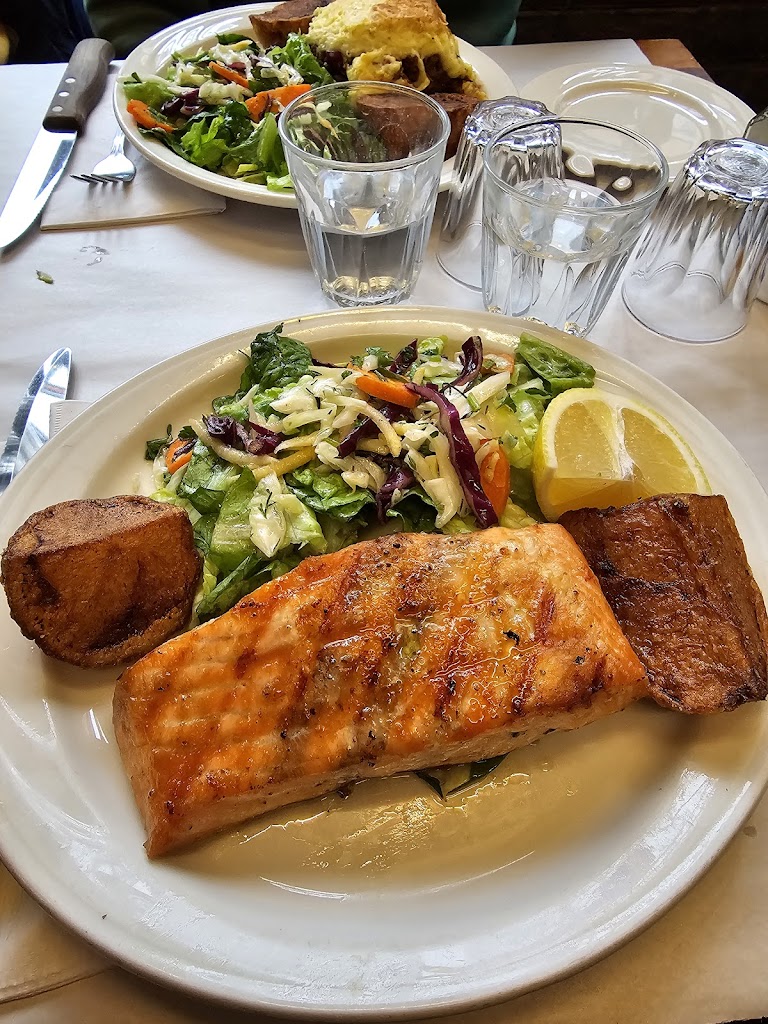 The Atlantic catfish the fish of the day was excellent. The service was good we did not have to wait too long to order and get our food. We ate outside and it was very agreable. It's fall and it's cold but the garden is well heated.